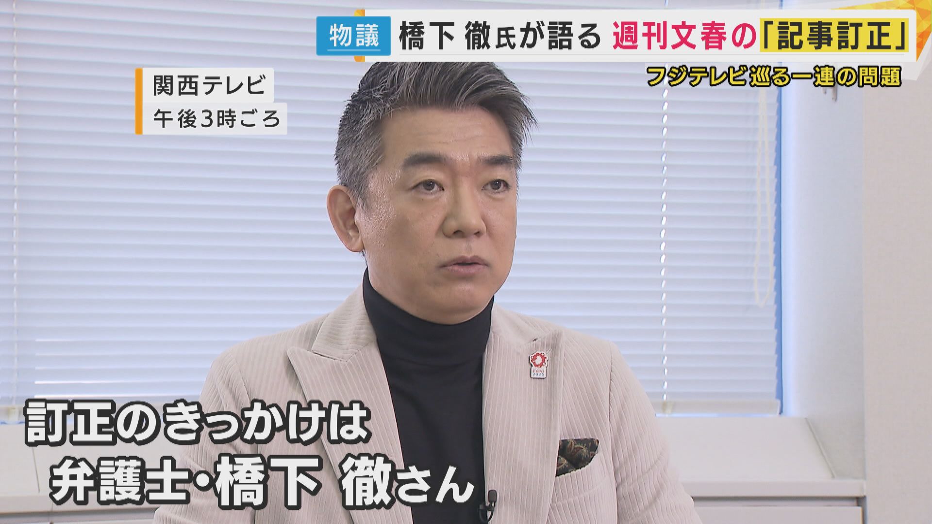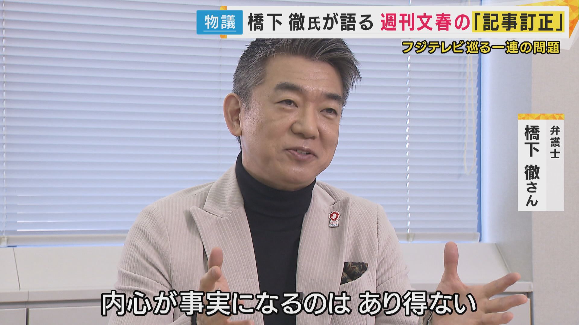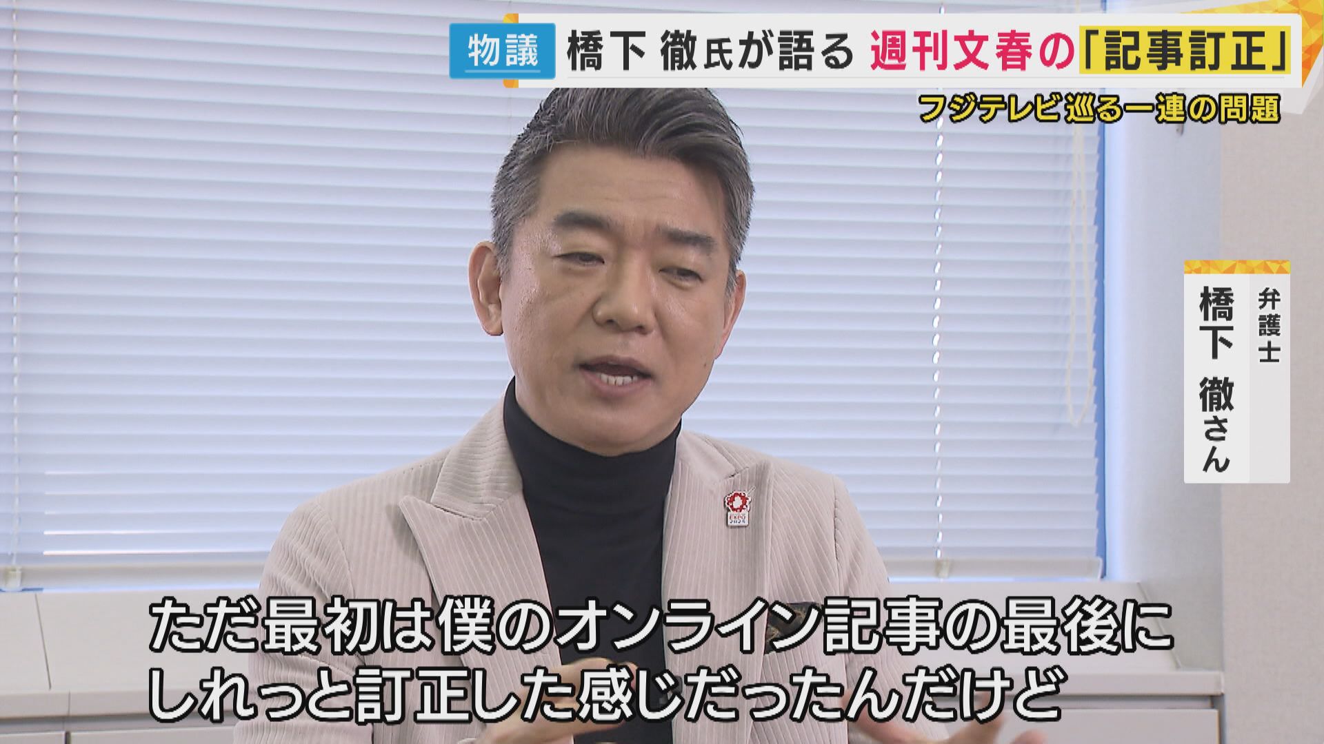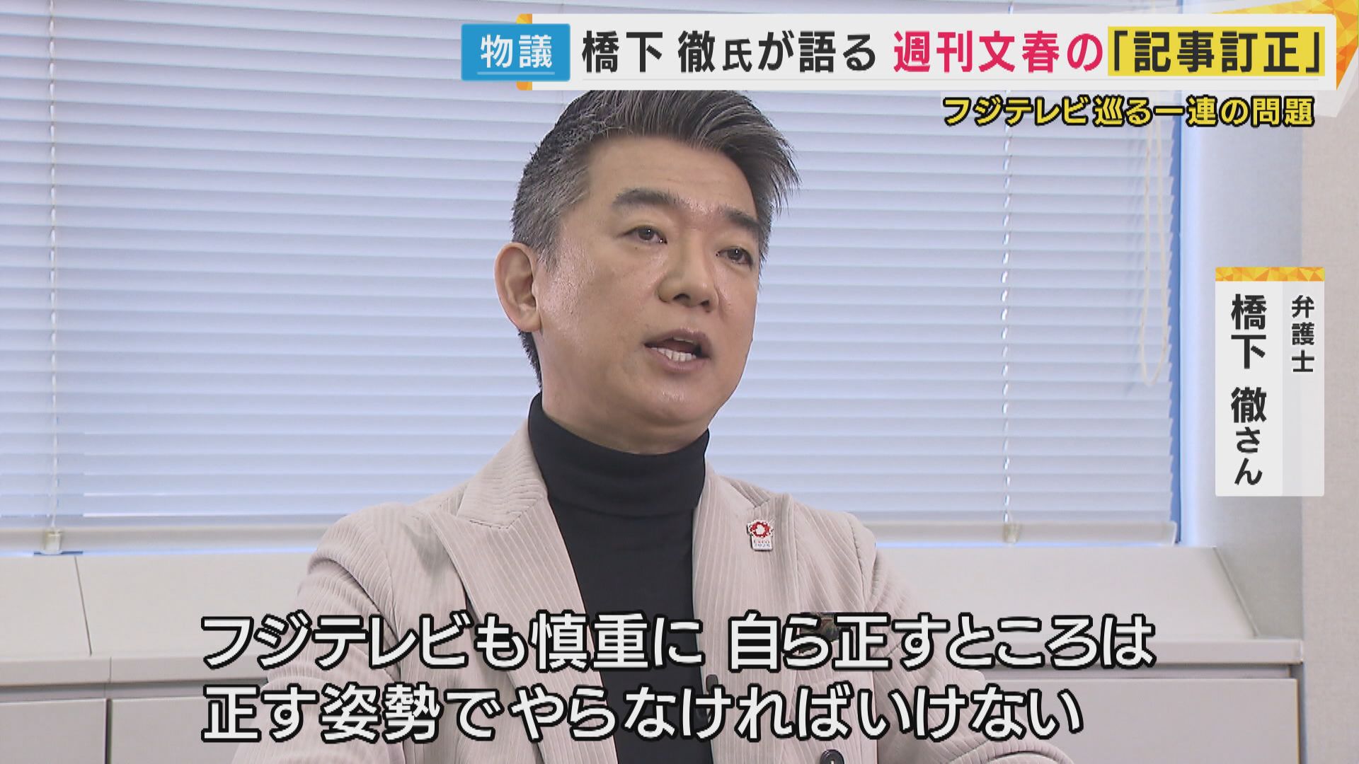 【弁護士 橋下徹さん】「文春の間違いは指摘しながらも、フジテレビのコンプライアンスの体制が不備だったことは間違いないので、コンプライアンスの担当部門も入れて、しっかりヒヤリングしていくことは絶対条件。フジテレビも慎重に、自ら正すところは正す姿勢でやらなければいけない」