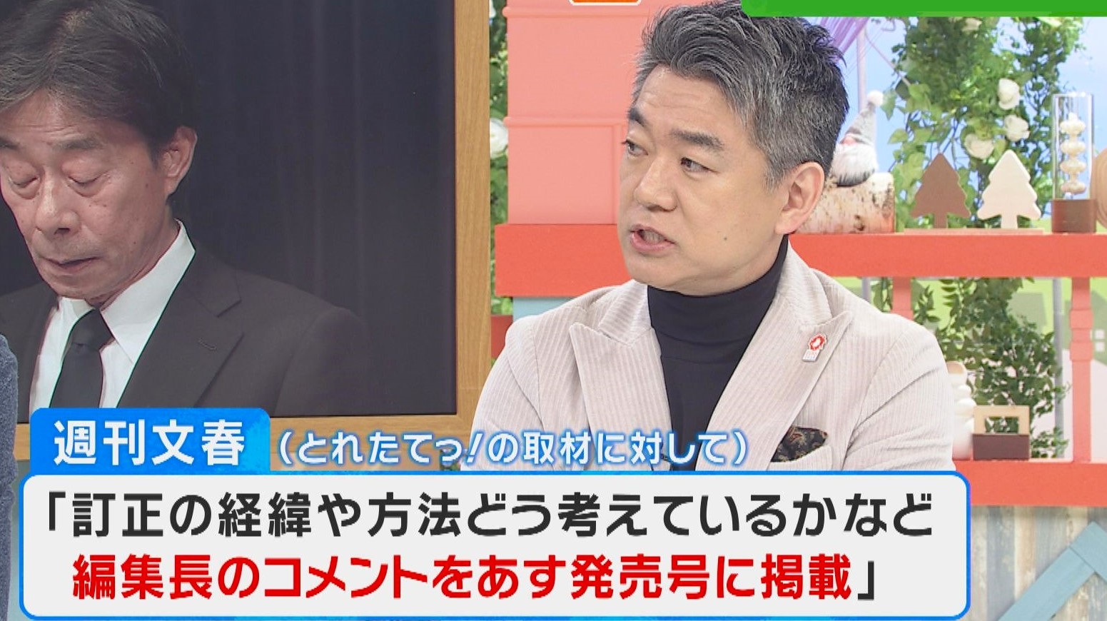 【橋下徹さん】「あの“10時間会見”の質問者はほとんどそれ前提で、『A氏が関与してたんでしょ』と。僕はこの“しれっとした訂正”の仕方もおかしいじゃないかと。SNSでもいろんな人がそういうことを言い出したもんだから、文春はフジテレビの会見が終わった28日に、こういう形でおわびして訂正した。やるんだったらフジの会見の前にやらなきゃいけない」