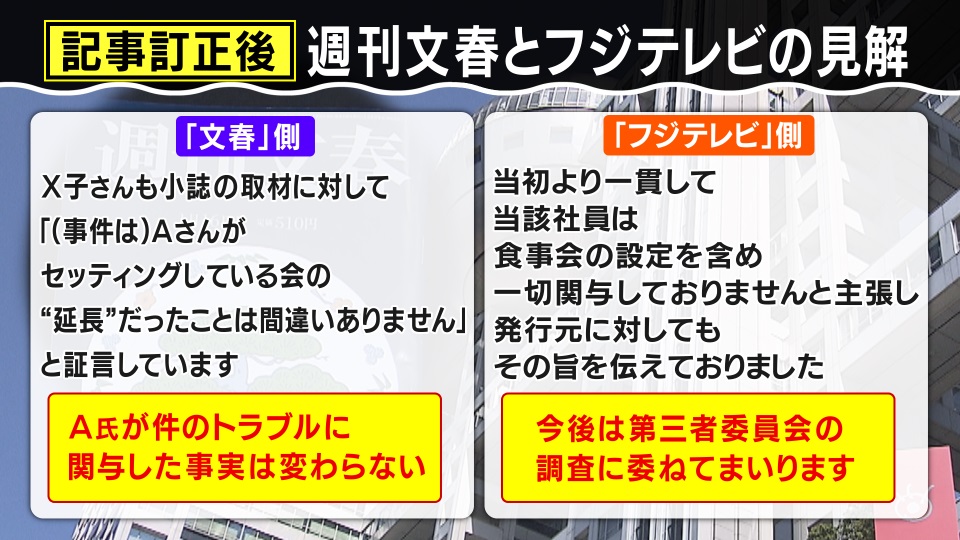 文春の記事訂正に関して、フジテレビ側は「当初より一貫して当該社員は食事会の設定を含め、一切関与しておりませんと主張し、発行元にも対してもその旨を伝えておりました。今後は第三者委員会の調査に委ねてまいります」とコメントしています。