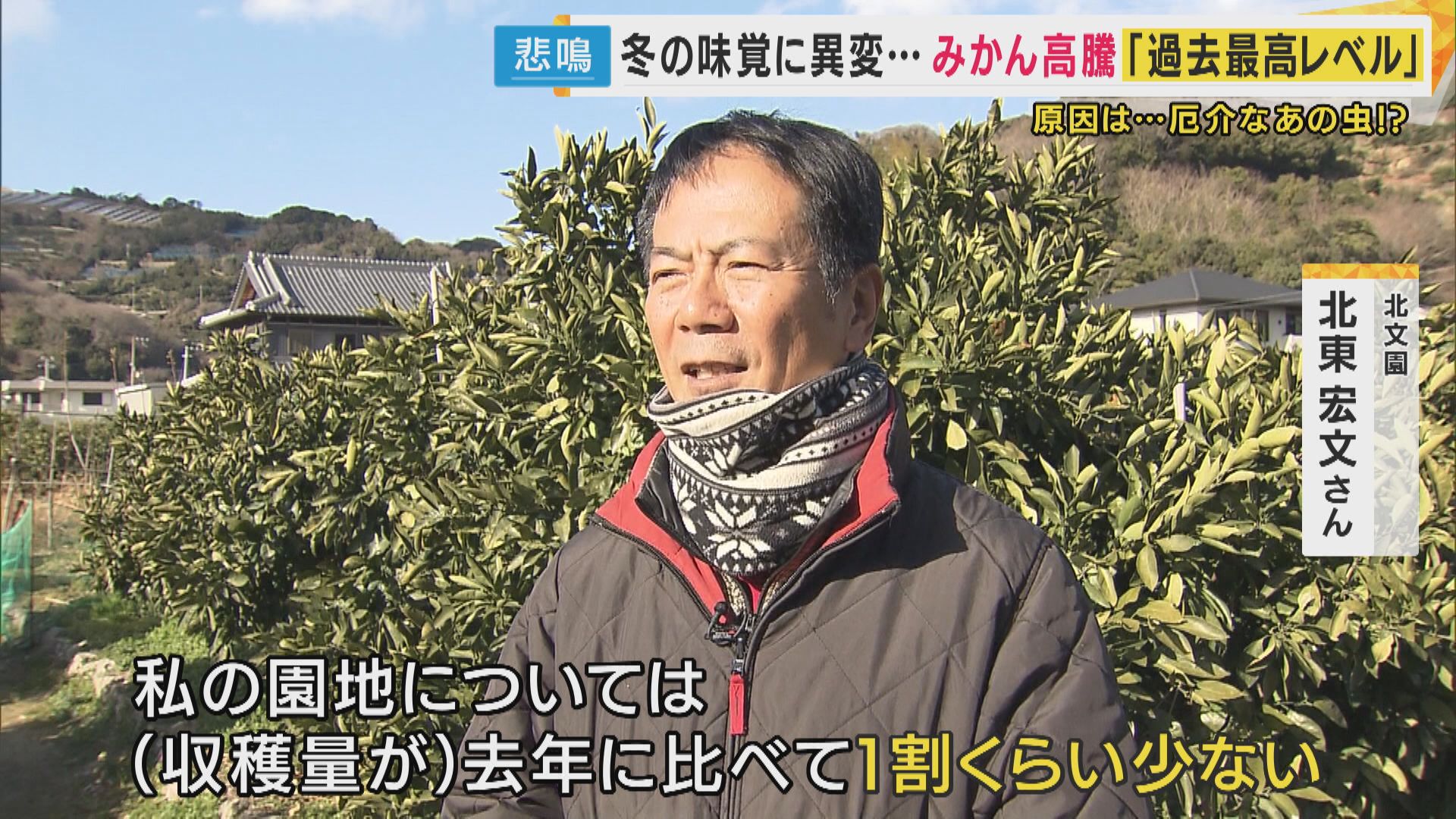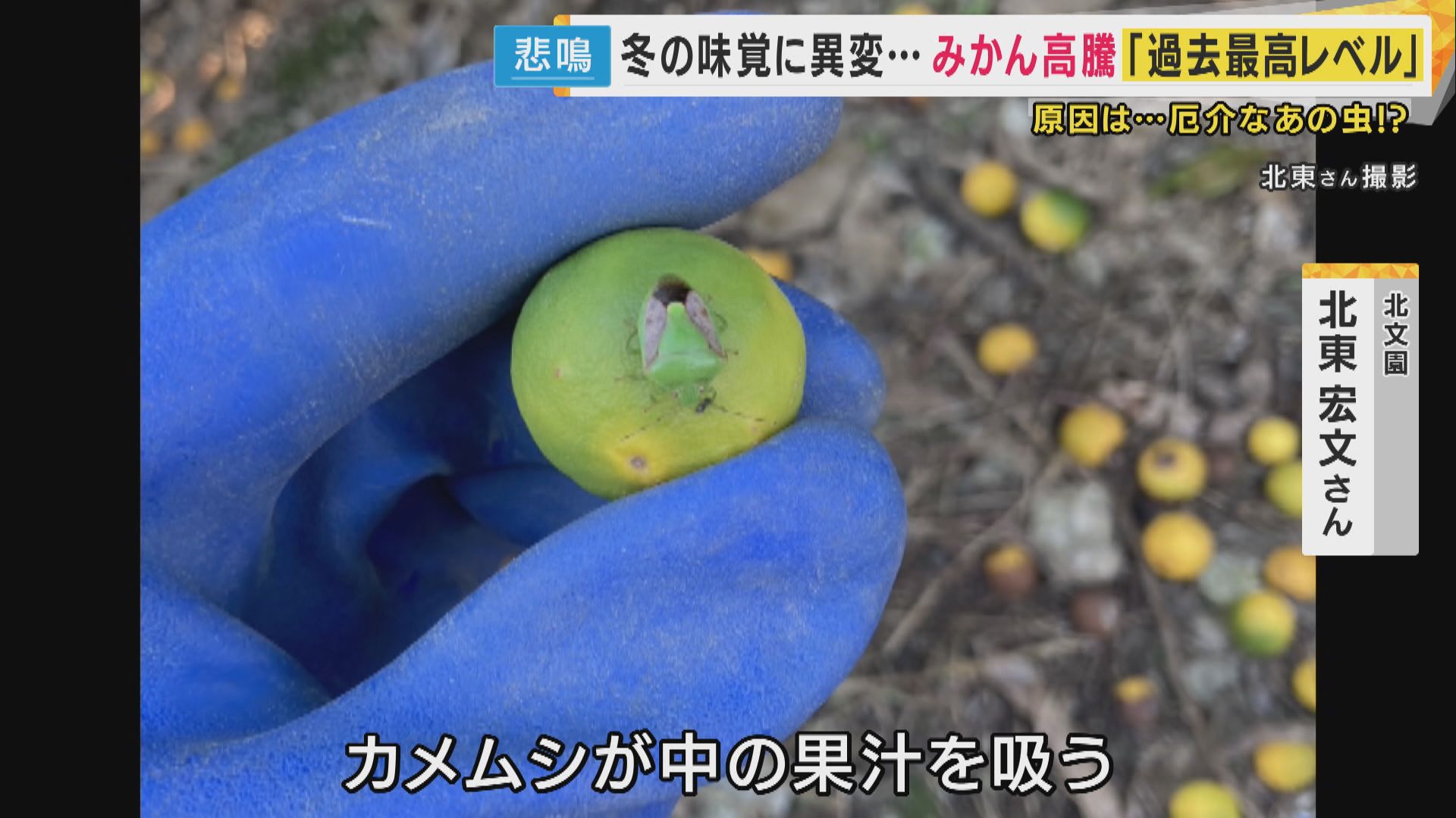 【北文園 北東宏文さん】「根本的に薬をまいてカメムシを忌避させる方法はないみたいです。みかん農家としてもここまでの価格高騰は望んでいないです。子供でもお年寄りでも食べやすいのがみかんの特徴なので、適正な価格でとどまってほしいというのが正直なところですね」