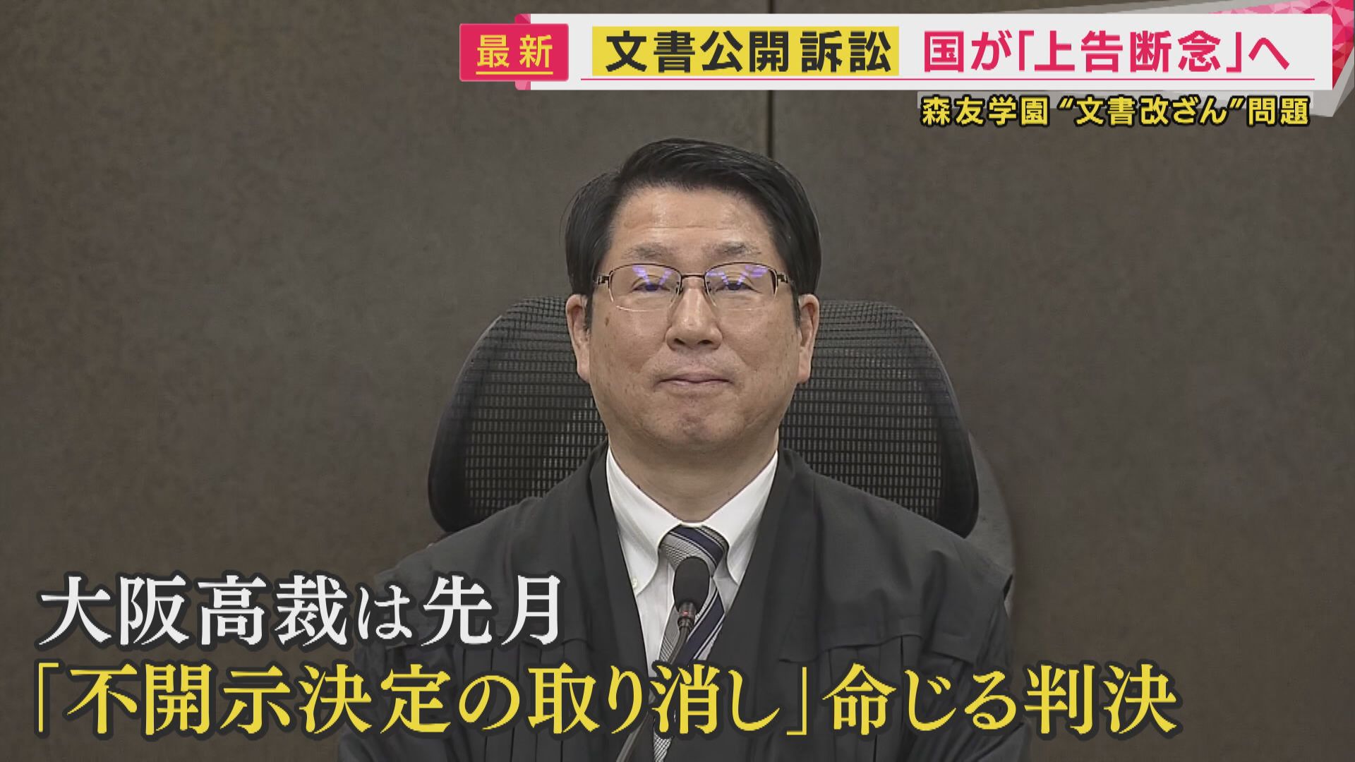 「森友学園」を巡る財務省の文書改ざん問題で、大阪高裁が国に対し、公文書の不開示決定の取り消しを命じたことを受け、国は上告を断念する方針を示しました。