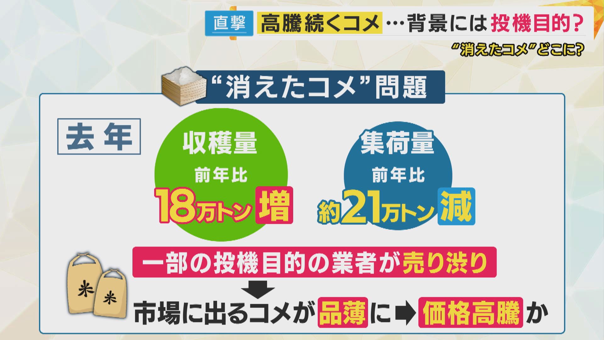 収穫時にはあったはずのおよそ21万トンは、投機を目的とした一部の業者が抱え込んで売り渋り、その結果、市場に出回るコメが品薄になって、価格が上がっているのではというのが、いわゆる“消えたコメ”問題です。