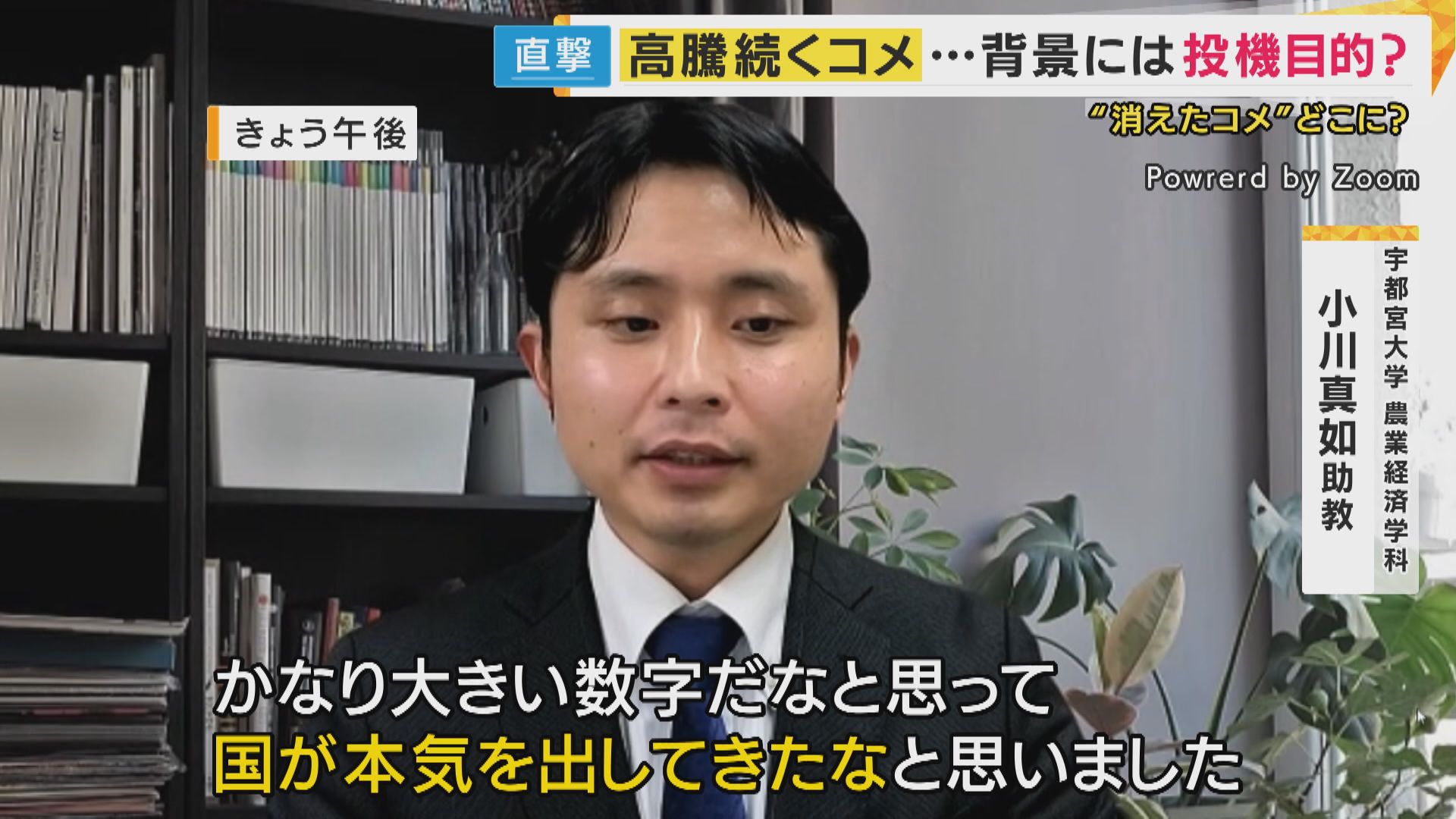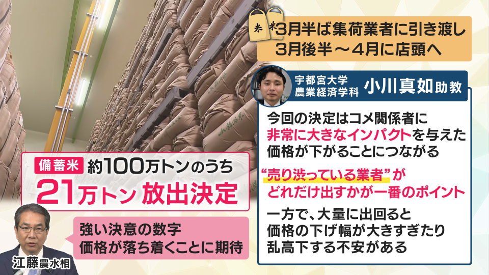 【宇都宮大学農業経済学科 小川真如助教】「かなり大きい数字だなと思って、国が本気を出してきたなと思いました。売り渋っている業者がドンと出してくるかに、全てがかかっているかなと思います。もうちょっとヤバいなとなれば、『早めに利益を確定させよう』とか、『損切りしてでも早くコメを手放したい』という業者が出てくるのではないか」
