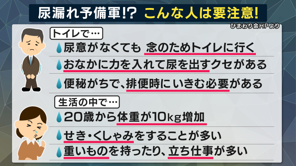 「尿漏れ予備軍。こんな人は要注意」チェックリストを見ていきます(※「ひまわり会」HPより作成)。