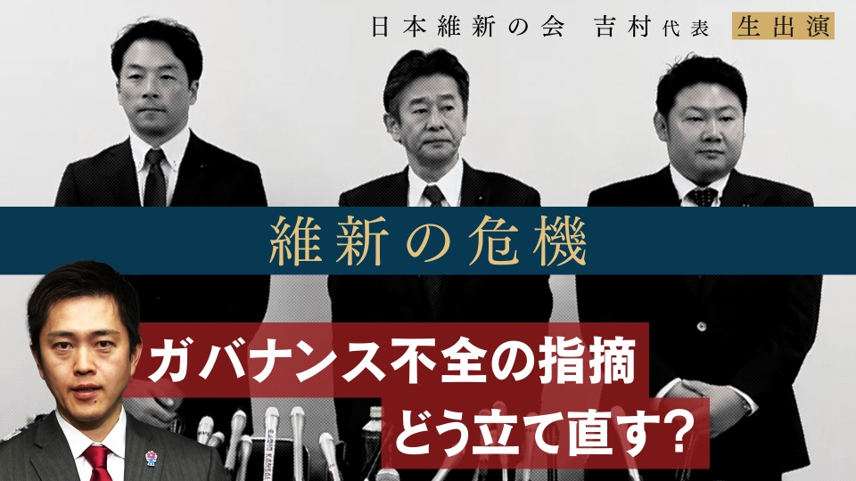 【吉村洋文代表】「きちんとルールを作るのは当然ですが、例えば知事とか市長の場合、組織がしっかりしてるんですよ。でも政党はそういうのじゃないから党のガバナンスが非常に難しいなと思っています。僕が2代目だから結構大変だと思います。でも3代目、4代目はありうる話なので、党としての初代の創業者じゃなくてもガバナンスを利かせた効かせるためのあり方、ガバナンス委員会っていうのを僕は立ち上げました。僕も間違っているところ、弱いところもあるかもしれない、そこをしっかりとガバナンス委員会から見てもらう。そこで組織として維新の会として、松井さん、橋下さんのような、ある意味人に頼るんじゃなく、党としてのあり方が問われている、評価する方法を模索していきたいです」