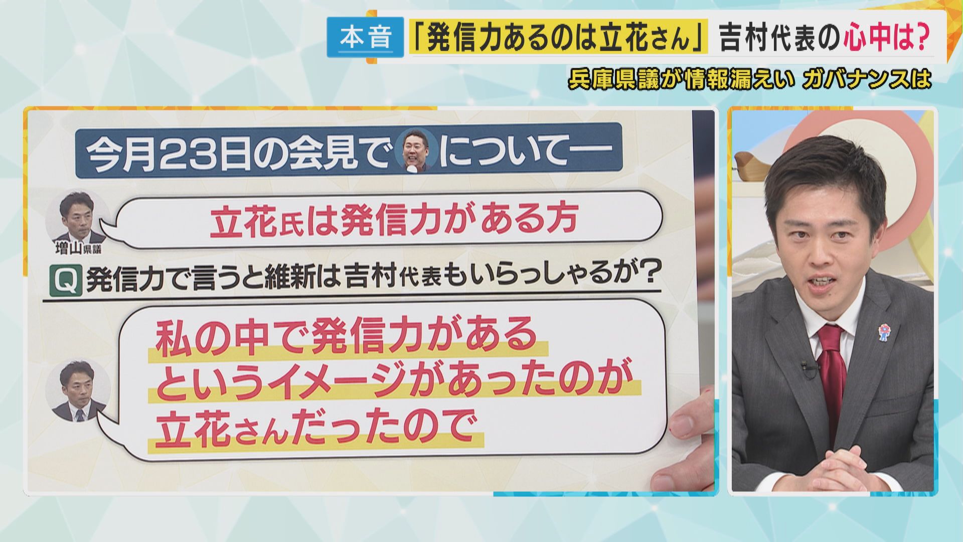 増山氏は23日の会見で『立花氏は発信力のある方』と話していて、発信力でいうと維新は吉村代表もいらっしゃるがという質問に対して、『私の中で発信力があるというイメージだったのが立花さんだった』と言っています。 これについて吉村さんは名前も出ていますが、どう受け止めますか。