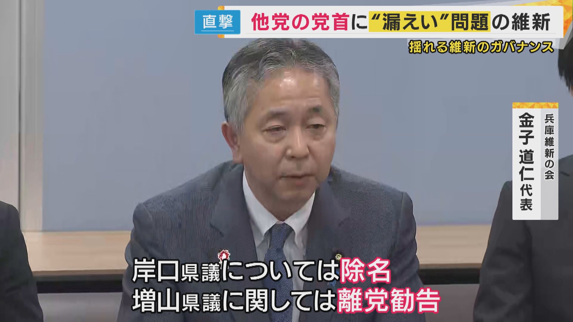 【兵庫維新の会 金子道仁代表】「このたびは県民の皆さんに深いご迷惑、不信をおかけしてしまったこと、大変申し訳ございません。岸口県議については除名、増山県議に関しては離党勧告という処分を決定させていただきました」
