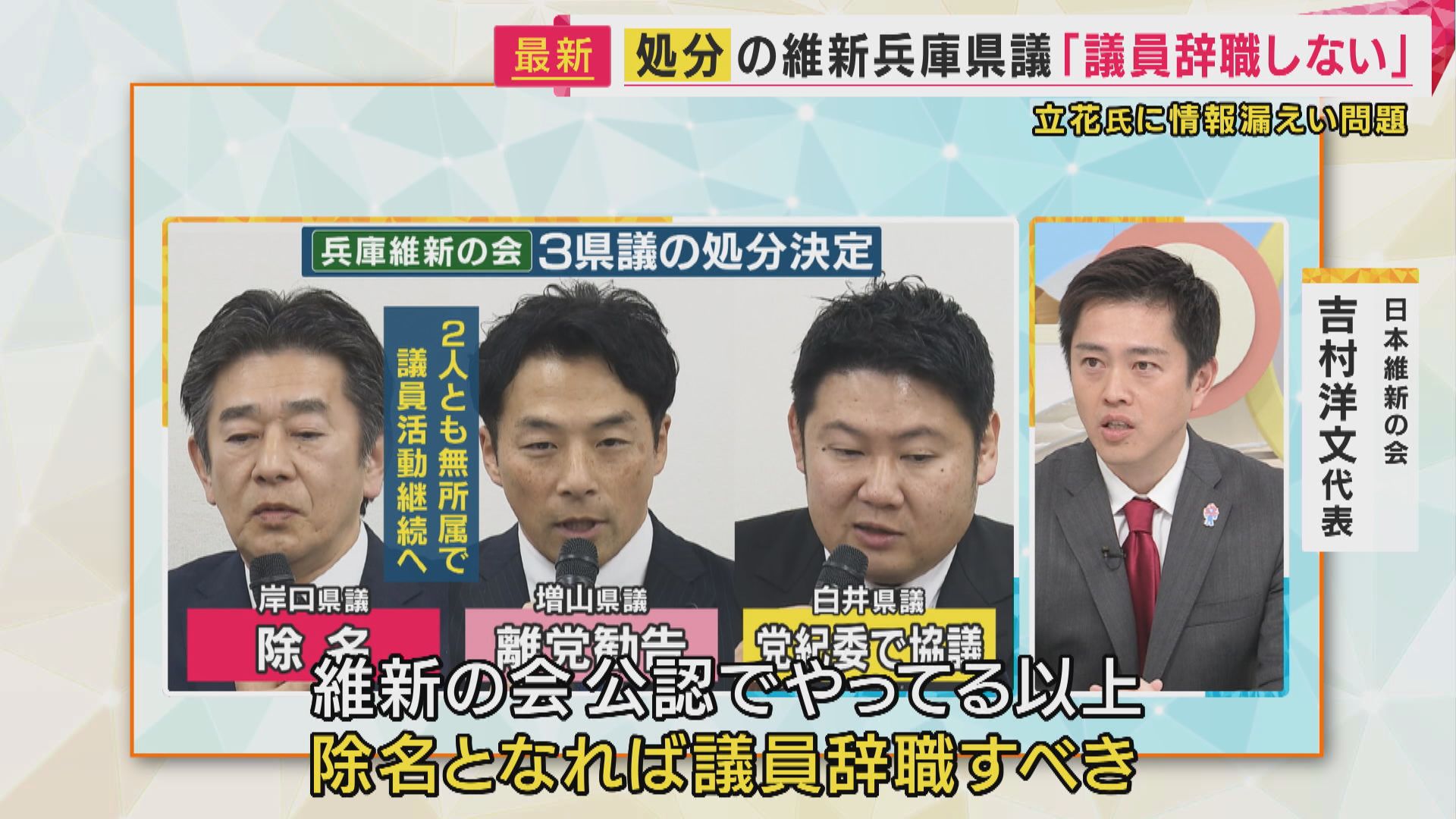 【日本維新の会 吉村洋文代表】「管理監督責任の立場の人が、真偽不明の情報を立花氏に渡していたのは非常に重い。自分の行為が間違っていない自信があるのであれば、無所属で(選挙に出て)兵庫県民に信を問うて、県民が議員として認めるなら別だけど。維新の会公認でやってる以上、除名となれば、僕は議員辞職すべきと思います」