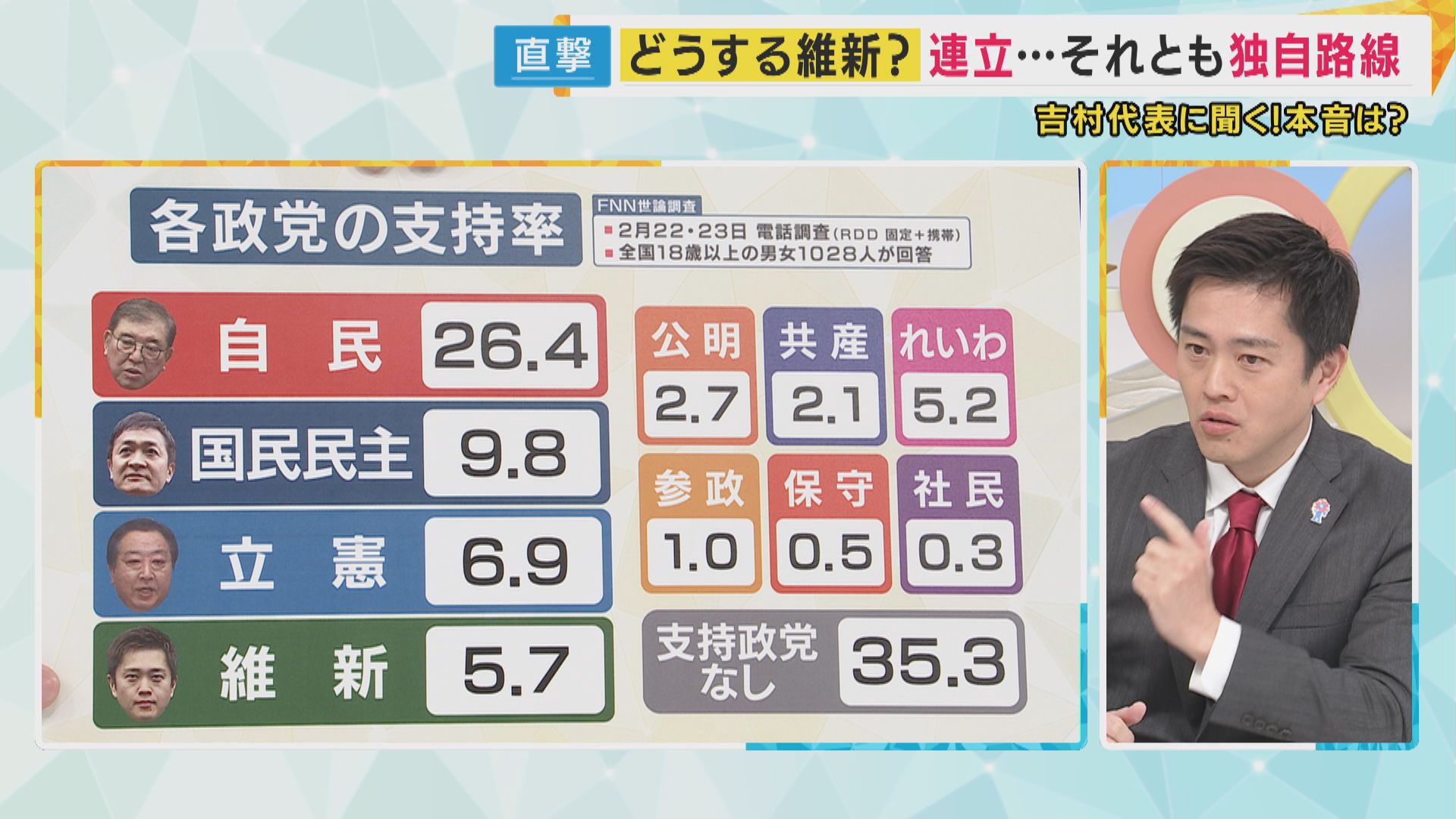 【吉村代表】維新「自民入り・連立入りは0%」と明言「支持率4番目」も「一喜一憂する政治やりたくない」