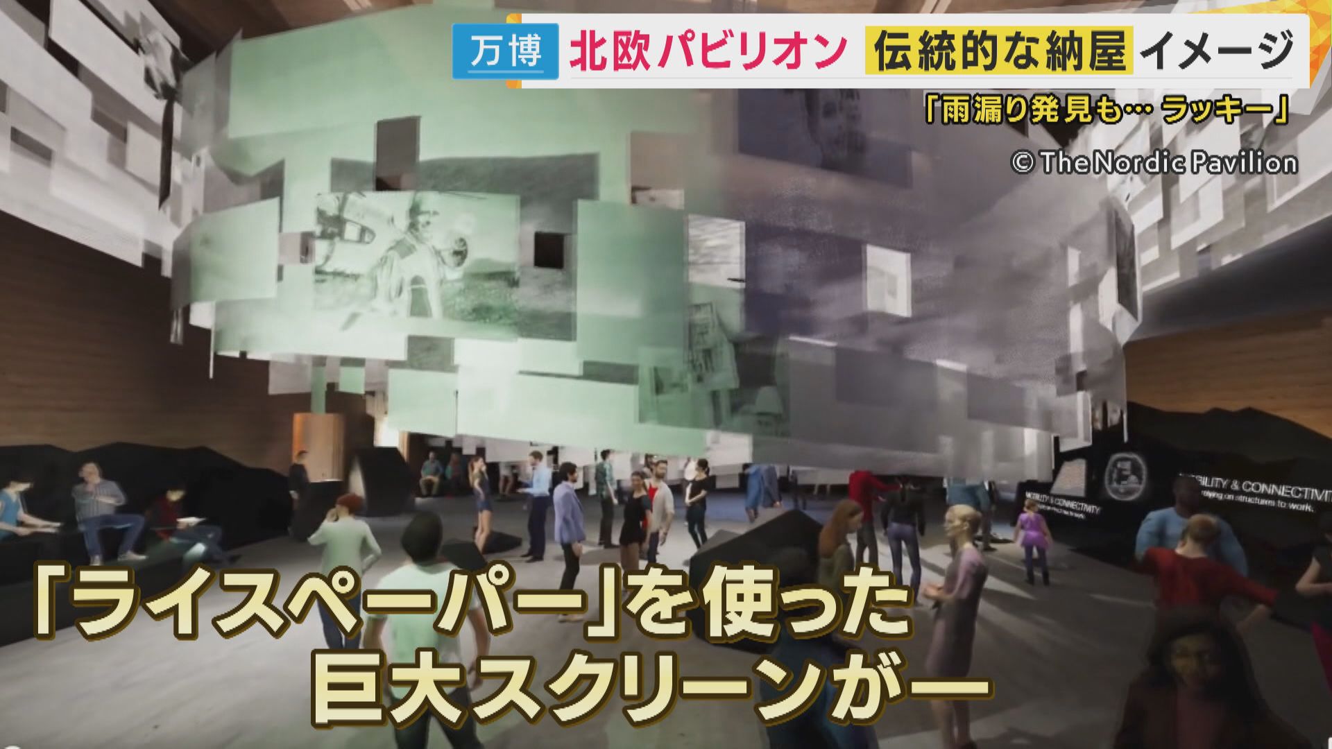 中はまだ未完成ですが、廃棄予定の米から作る「ライスペーパー」を使った巨大スクリーンが渦を巻くように吊るされ、北欧の人々の日常などが映し出される予定です。