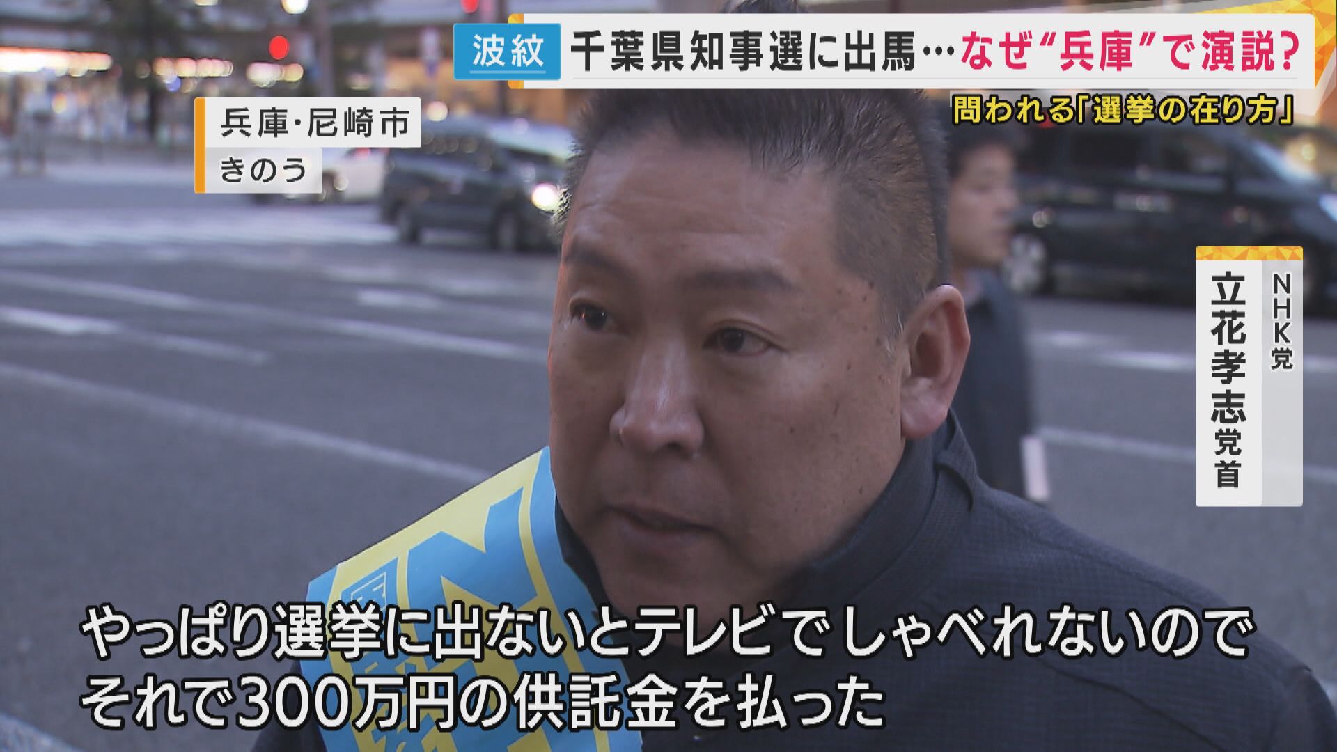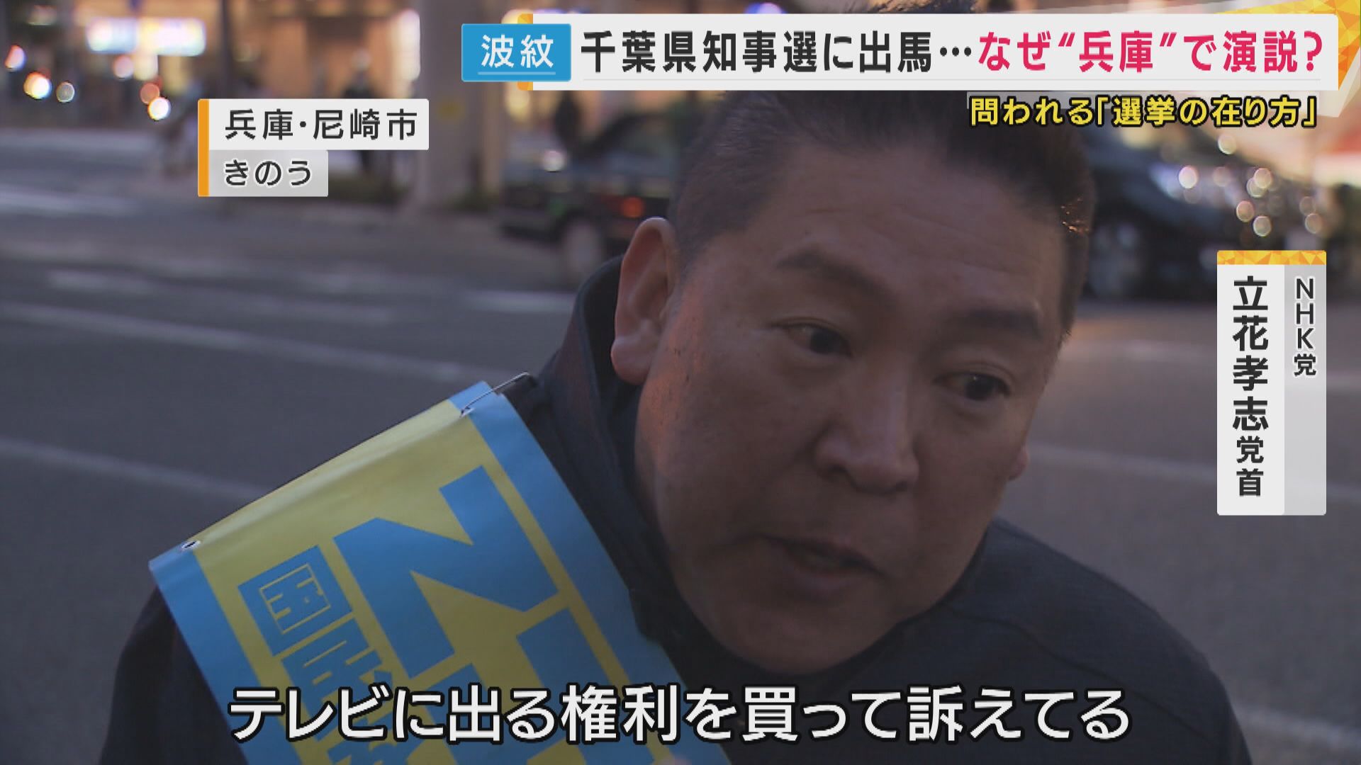 県知事選には4人が立候補しているのですが、立花党首の姿は、なぜか兵庫県にありました。