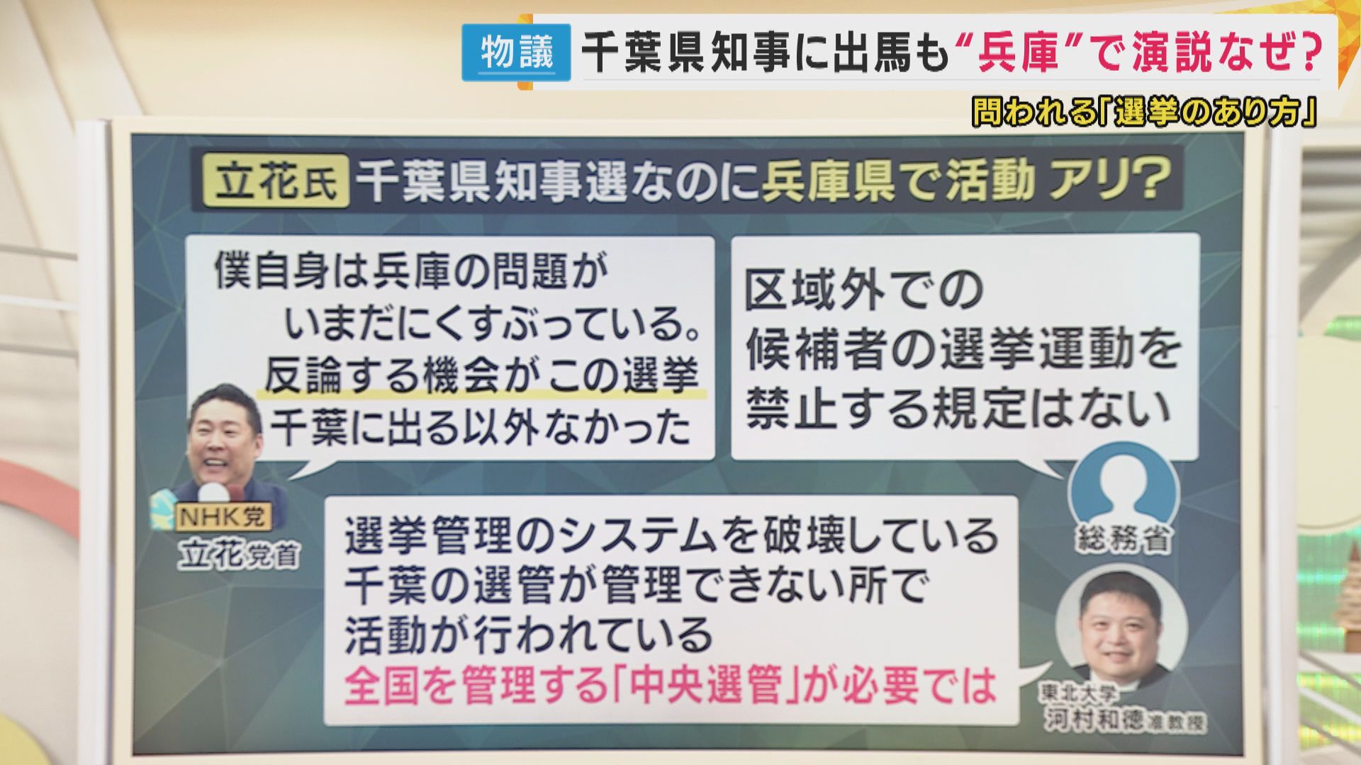 NHK党・立花党首による異例の選挙活動について、選挙制度に詳しい東北大学の河村和徳准教授は、「選挙管理のシステムを破壊している。千葉の選挙管理委員会が管理できない所で活動が行われている。(都道府県をまたいで)全国的に選挙を管理する『中央』の選挙管理委員会が必要ではないか」と指摘しました。