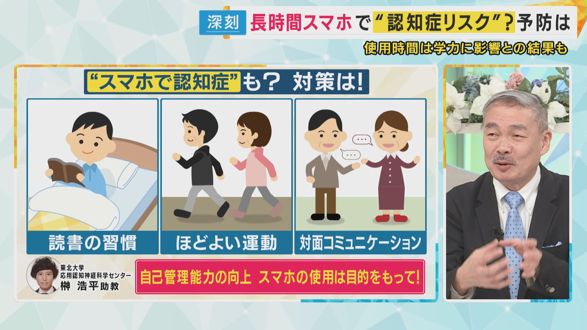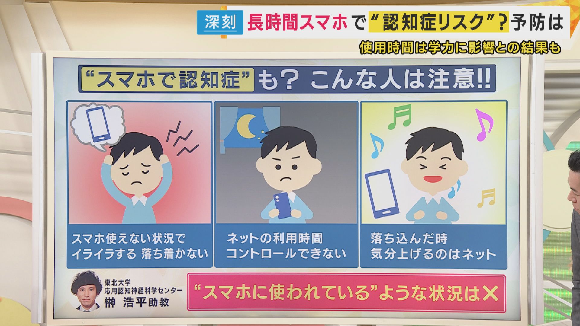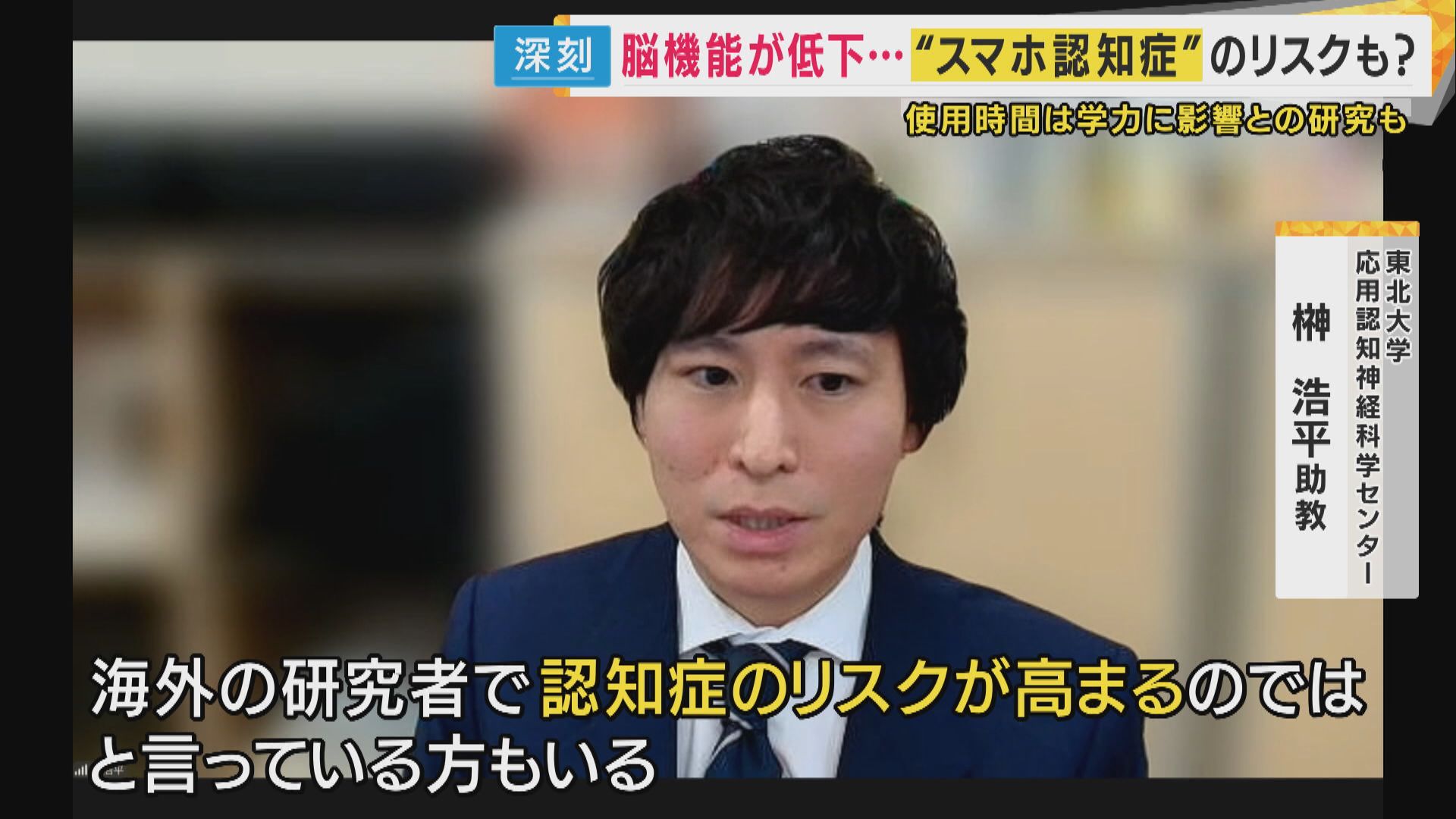 【東北大学応用認知神経科学センター榊浩平助教】「スマートフォンで文字を入力する習慣が増えることによって、ペンで紙に文字を書こうとしたときに、漢字が出てこなくなってしまうと。 スマホの使いすぎというのは、脳の機能の低下を早めてしまう恐れがあるのではないか。海外の研究者では認知症のリスクが高まるのではないかと言っている方もいらっしゃる」
