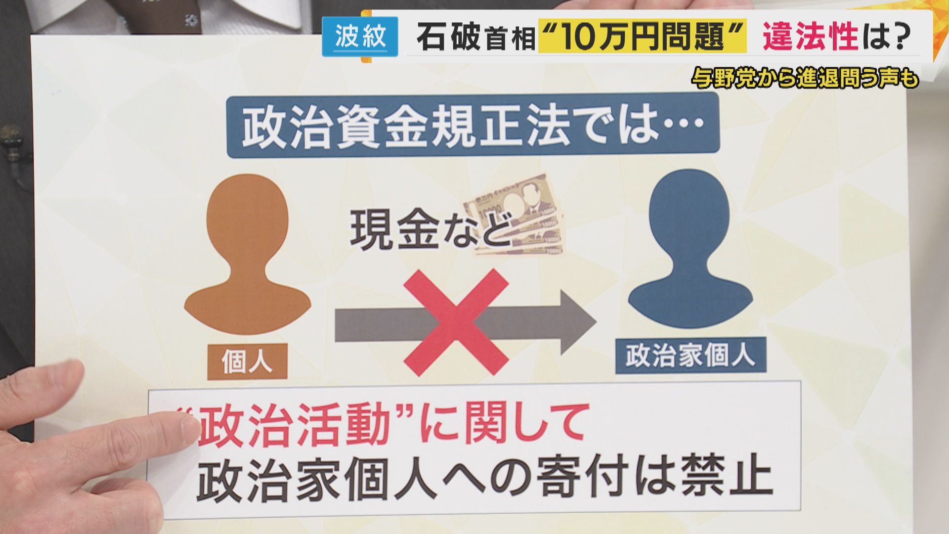【関西テレビ 神崎博報道デスク】「政治資金規正法に引っかかる可能性があるかと思います。『10万円の商品券』というのは、規正法上の『現金など』に含まれるので、引っかかる可能性があります」