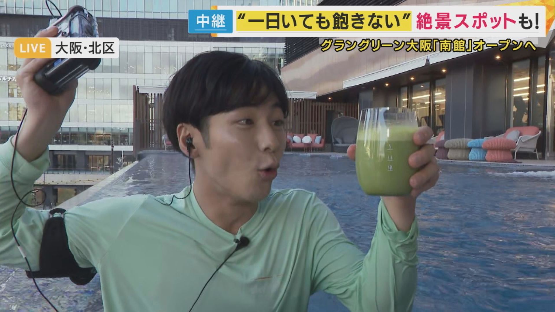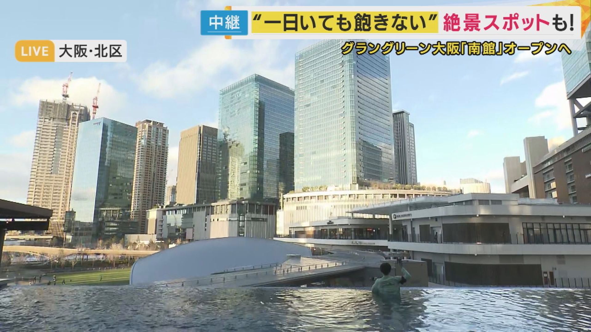 【秦令欧奈アナウンサー】「こちらに見えますのが去年開業したグラングリーン大阪北館で、あちらに見えますのがJR大阪駅。そして、こちらが今週金曜日に開業する、南館です!大迫力ですね」
