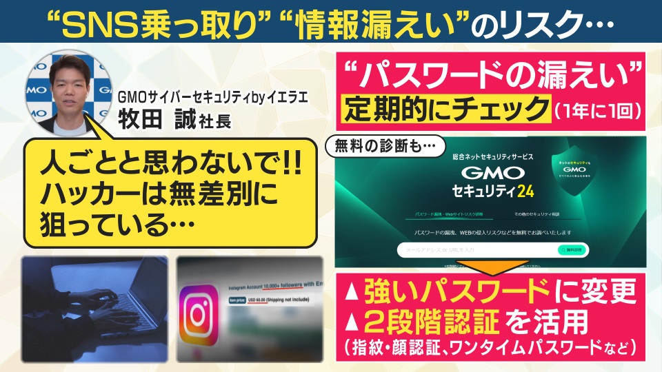 SNS乗っ取りを防ぐ方法について、サイバーセキュリティの専門家、GMOサイバーセキュリティbyイエラエの牧田誠社長によると、「人ごとと思わないで。ハッカーは無差別に狙っている」と言います。