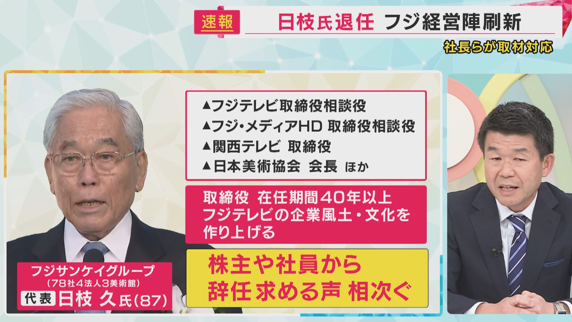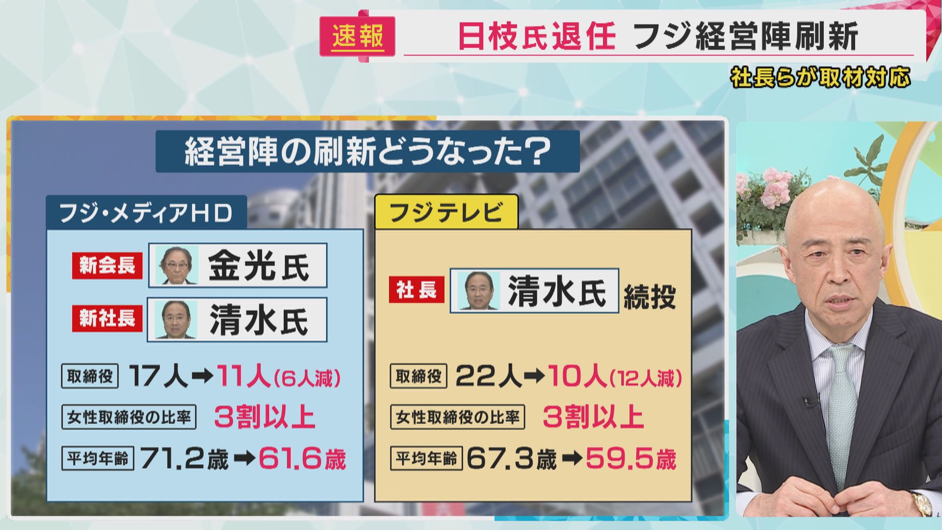 【関西テレビ 神崎博報道デスク】「あまりにも長すぎたために、影響力はかなり大きくて、ある種、日枝さんの“独裁”ということがフジ社内外から聞かれ、そのような体制に批判もありました。今回、経営陣を刷新する、若返るということで、年齢のこともあり、日枝さんが退くという判断になったと思います」