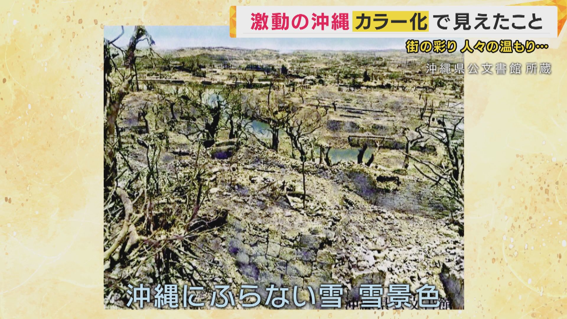【“戦中”監修 喜納大作さん(41)】「首里城からの眺めですね。灰が積もっていて、(当時は)『首里、雪降ってるのかと思った』みたいな話もあって、それっぽくカラー化できてるのかなと。白っぽい灰がつもっていたので、遠くからみたら雪降ってるのかなみたいな」