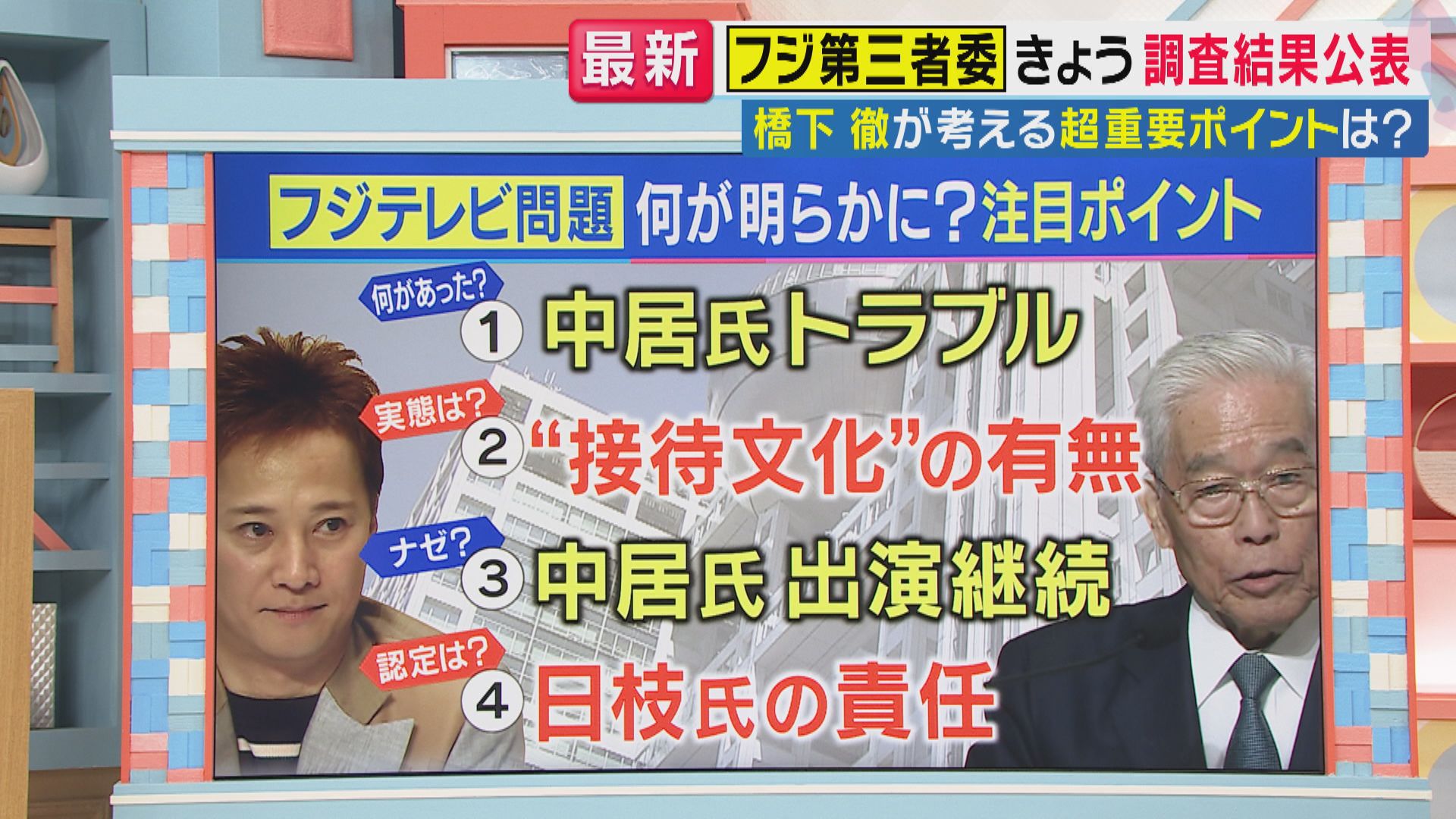 【橋下徹氏】「全ては1.(中居氏トラブル)のところですよ。中居氏のトラブルの内容。で、これは詳細に公にすることはできない部分もあります。これはプライバシーの問題とかそういうことで。ただ公にできないという話と、第三者委員会がしっかりそこを調査して、どういうトラブルだったかということを調査委員会が認定するって話は、これちょっと分けて認定は絶対必要です。というのは、中居氏トラブルがどういうものなのかによって、フジテレビの判断がそれが良かったのか、悪かったのかが評価できるので、この中居氏トラブルの所をもし避けた第三者委員会の報告書だったら、全く意味がないと僕は思います」