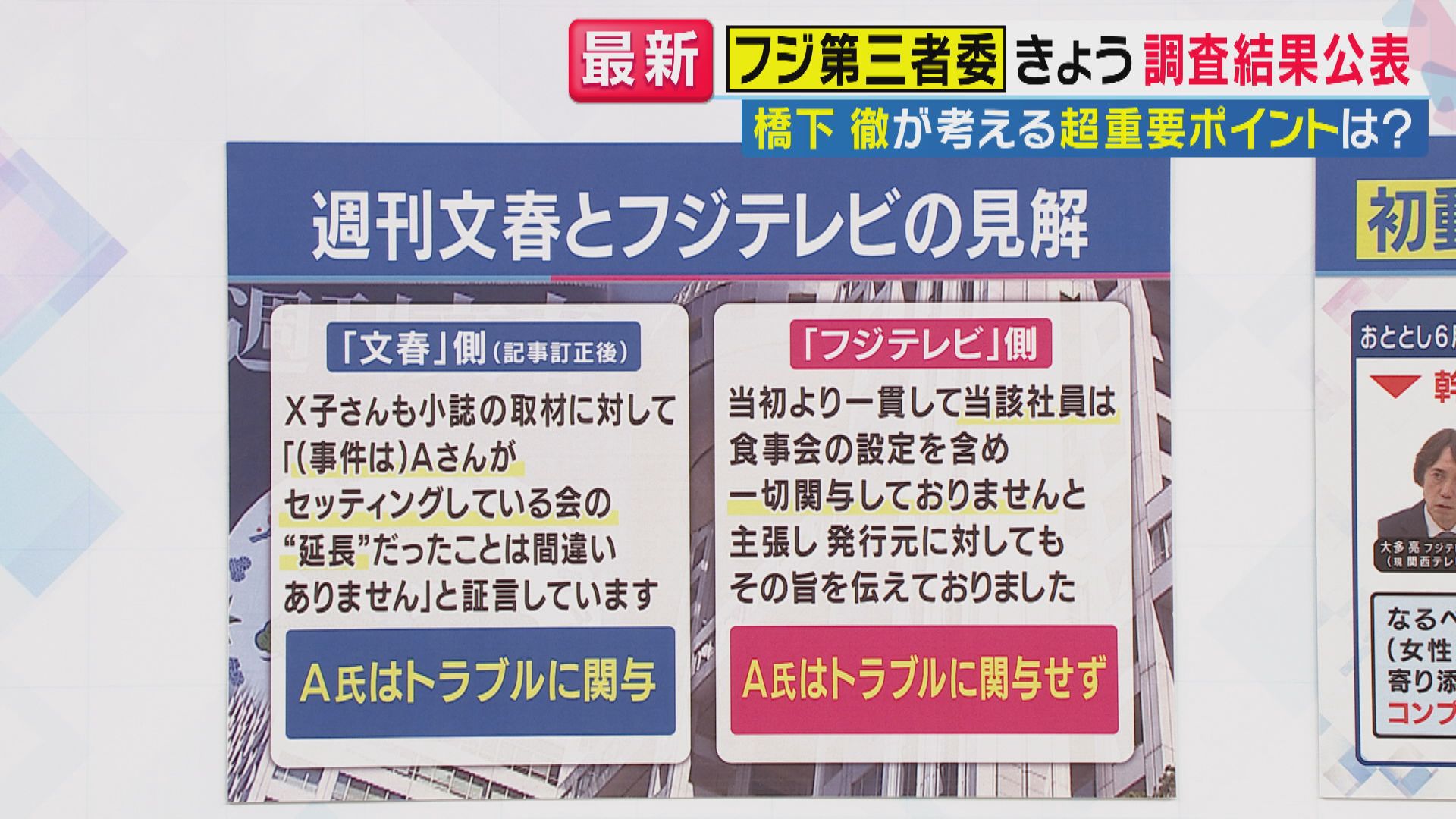 【橋下徹氏】「まずトラブルの当日にAさんは、フジテレビの職員は関与してない。ただ、10時間会見の時にみんな質問者は全てAさんが関与して、こういうトラブルが生じたと前提に、ワンワン質問してたけども、当日は関与してない。しかしその前のバーベキューにはAさんは関与していた。じゃあこの前に行われたバーベキューと、トラブルがあったその日。これがつながってるかどうかっていうのは、実は文春側は女性の気持ちしか証拠を出してないんですよ。女性の心として『つながっています』と言ってるだけなんです。客観的な証拠がないんですよ。だから第三者委員会は、しっかりその証拠を持ってAさんの関与、トラブルの当日の前のバーベキューと、それからトラブルの日がこれは一緒のものなんですという証拠をちゃんと出せるかどうかということですよね」