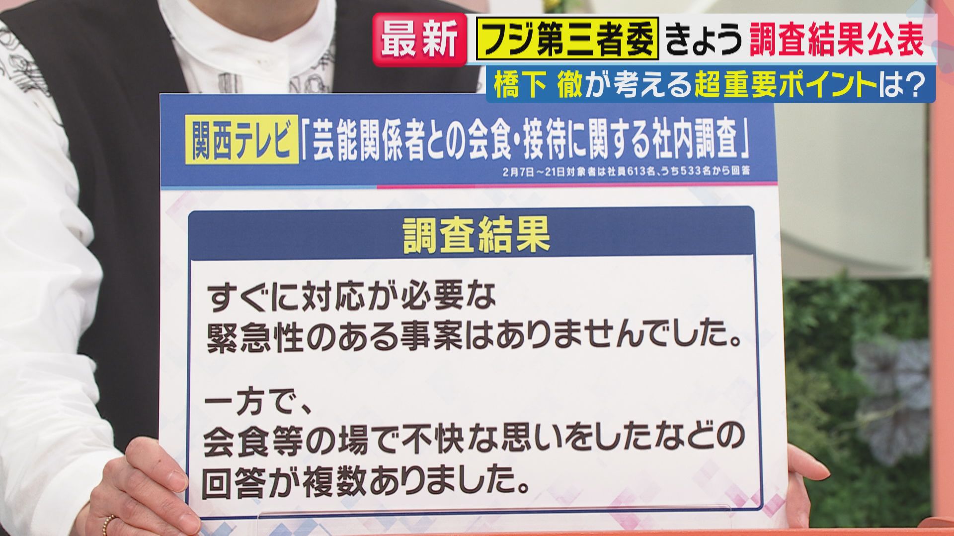 【関西テレビ 加藤さゆり報道デスク】「関西テレビでも今回のフジテレビの問題を受けて、芸能関係者との会食接待に関する社内調査を行いました。実際にそういう芸能関係者から何かあのセクハラですとか、そういった被害を受けたことありますかっていうような調査があったんですけれども、結果としては、『すぐに対応が必要な緊急性のある事案はありませんでした』と。『一方で会食などの場で、不快な思いをしたことがあったという回答は複数あった』ということです。