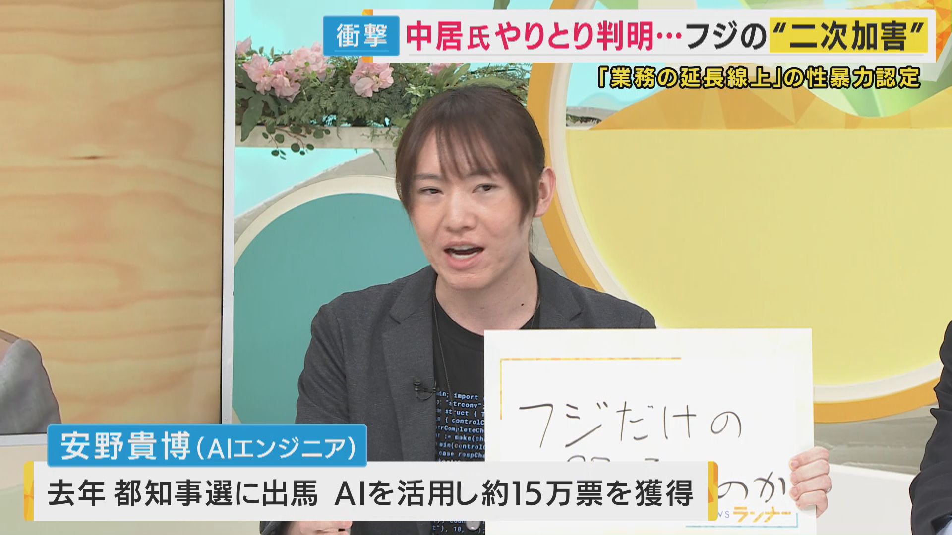 「フジだけの問題なのか」AIエンジニア安野氏「テレビ局文化の世間とのズレ」指摘「業界全体変わるべき」