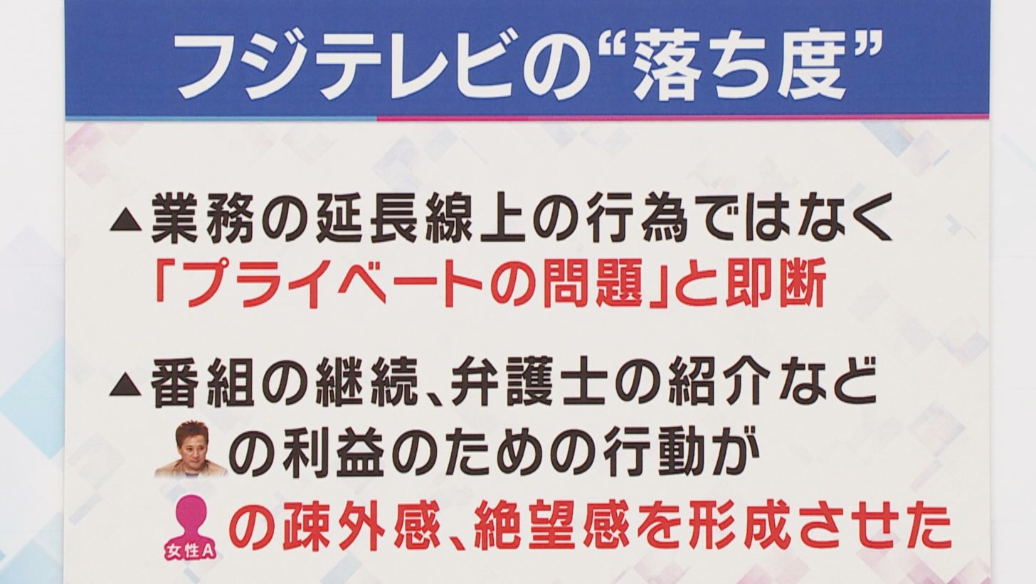 フジテレビにおいては、例えばハラスメントがあったときに厳正な処理がされないので、相談しても意味がないと思われている可能性があると。そういったことがあると、被害者によってハラスメント被害をしても、さらにそれが続いていく負の連鎖につながっていく、そういったことが認定されているんですね。なのできちんと会社側が人権であり、ハラスメントに対して、徹底的に対応していく。そういった企業づくりこれがポイントになってきます」