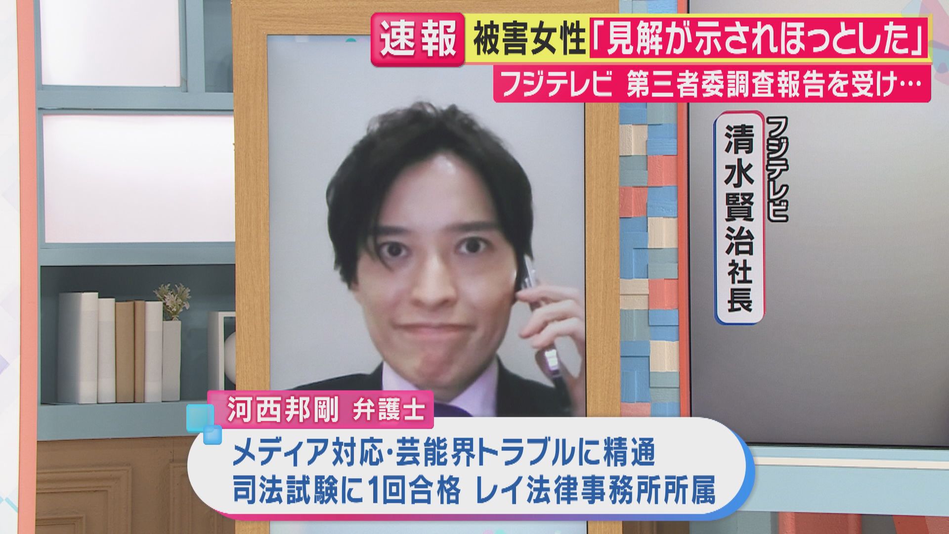 関西テレビ「旬感LIVEとれたてっ!」に電話で出演した芸能トラブルに詳しい河西邦剛弁護士は「第三者委員会の報告書は踏み込んだ内容で、フジテレビによる二次加害行為も認定していることは非常に重い事実」と指摘しました。
