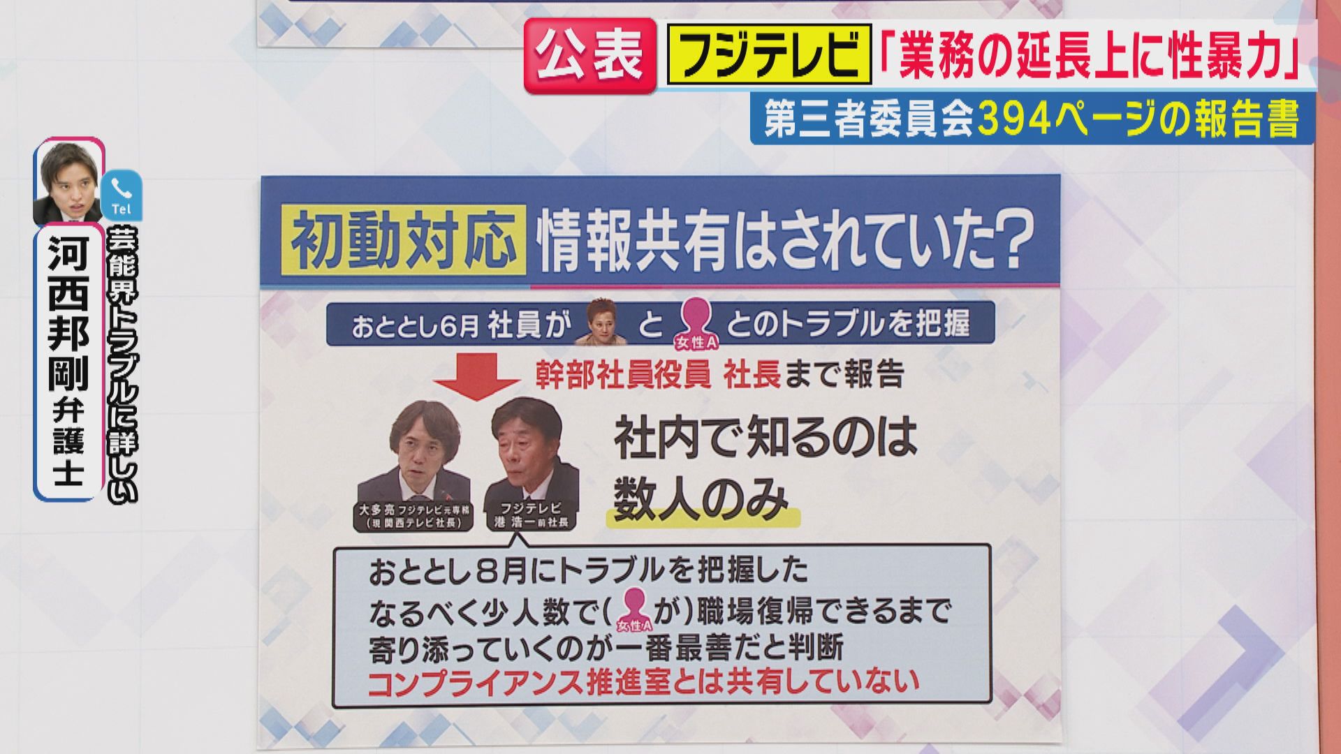 【河西邦剛弁護士】「港社長であり、大多(当時)専務ですけれども、コンプライアンス室に報告をせずに、自分たちだけで考えていたということなんですね。それに対して、1月27日の記者会見においては、『なるべく少人数で寄り添って、女性の社会復帰を目指していた』と(説明していた)。 ですが、それらはやはり会社の企業統治、きちんと人権を意識した上で人権侵害があった時には、きちんと対応することを会社の経営の基準として考えた時に、そういったことは適切ではないと、今回の報告書で認定されたということですね」