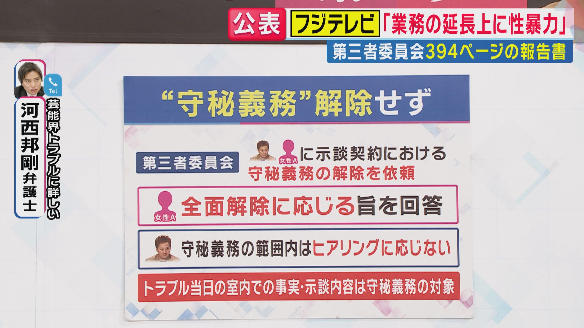 【河西邦剛弁護士】「具体的に言うと、中居さん側が守秘義務の解除に応じなかったそうすると、トラブル当日の部屋に入ってから、そして部屋が出るまでについては、守秘義務の対象になってくるので、女性側も話はできないという話になりますし、中居さん側もヒアリングには応じないという話になってきます」