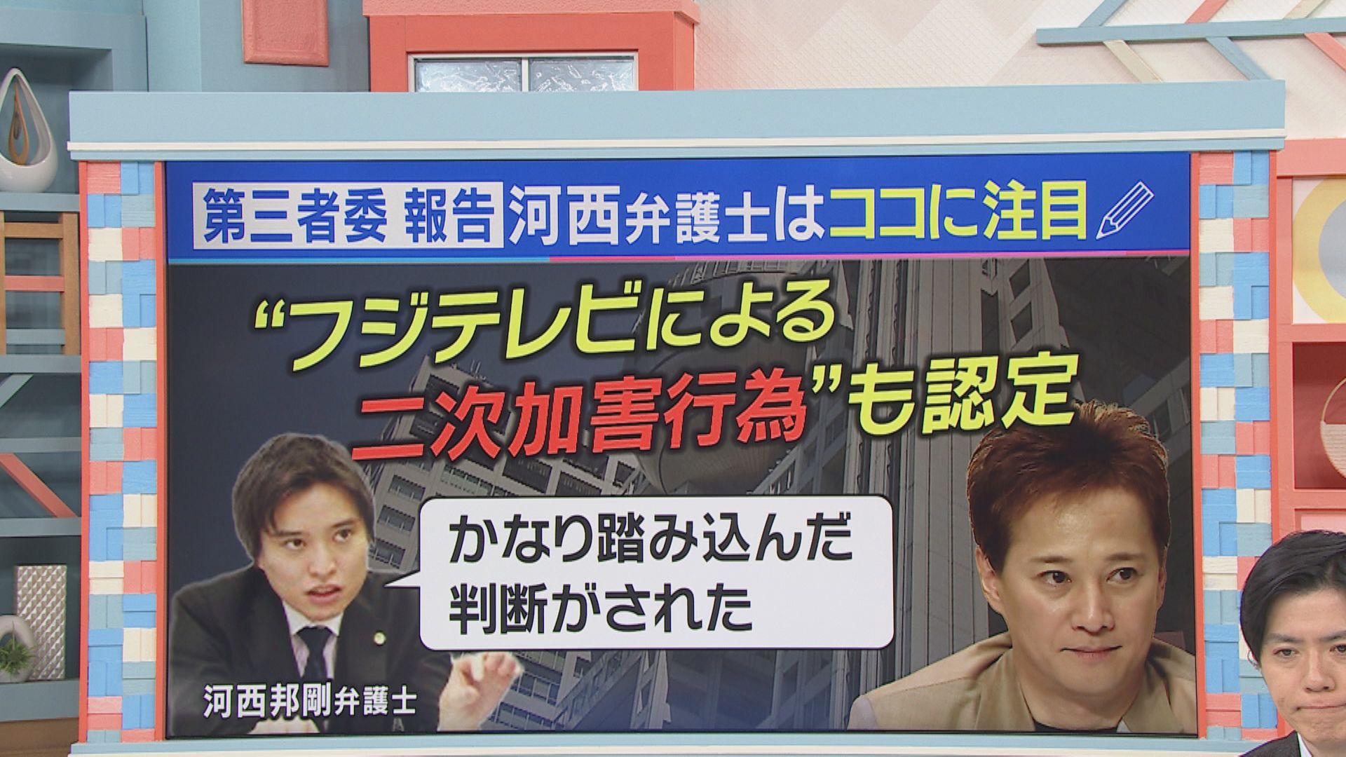【河西邦剛弁護士】「中居さんによる加害行為だけではなくて、フジテレビによる加害行為が行われた、これが第三者委員会により認定されたことは非常に重い事実です」
