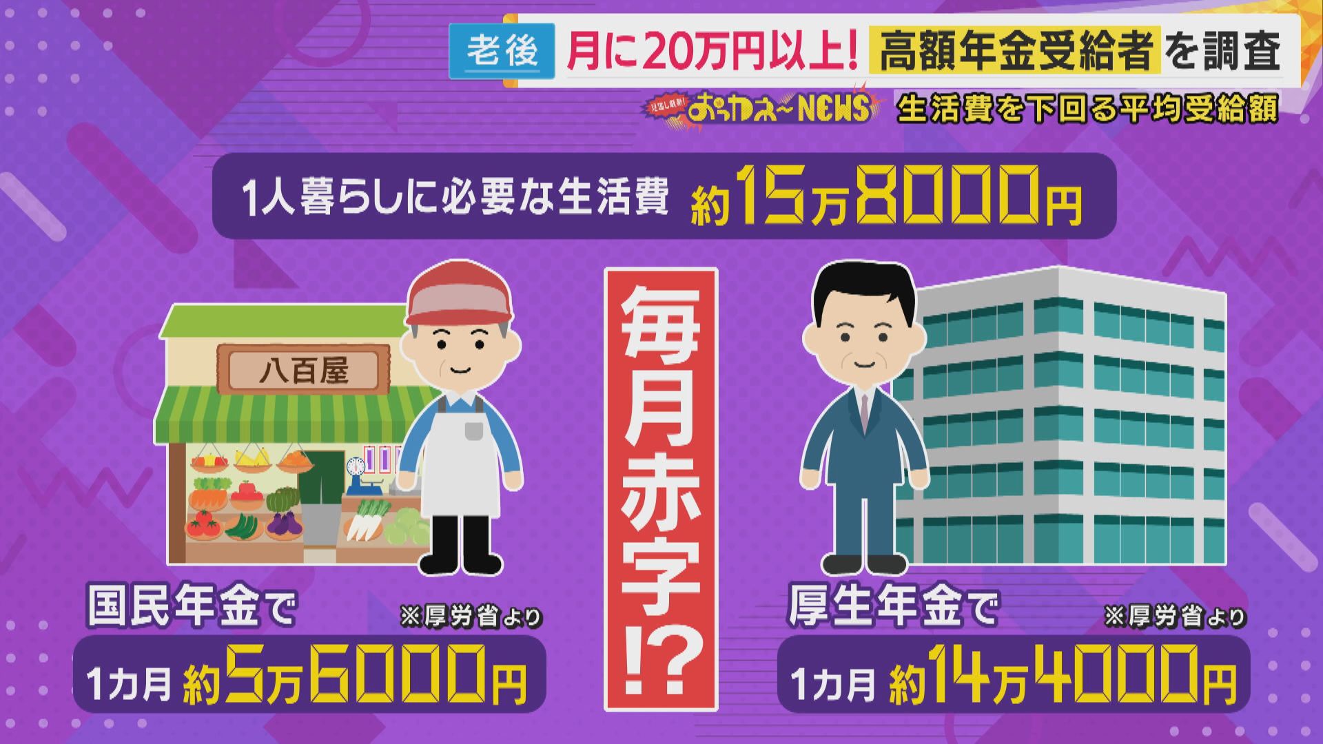 そんな中、年金受給額の平均は、自営業者などが加入する国民年金でひと月5万6000円、会社員が加入する厚生年金で14万40000円。