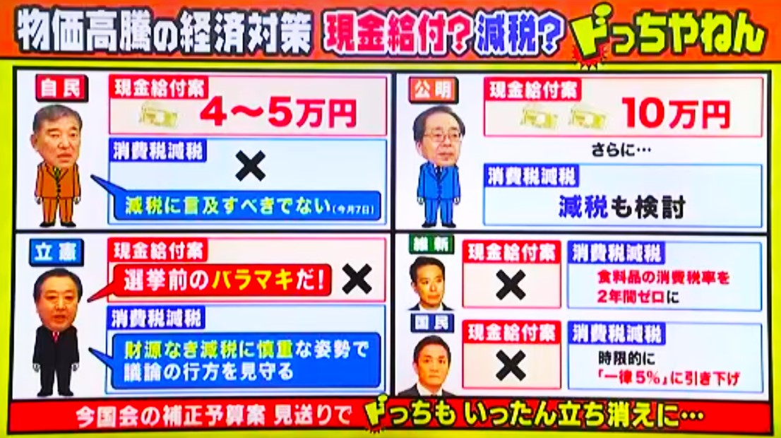 公明は現金給付案(10万円)さらに消費税減税も検討という立場。そして立憲民主は現金給付案は選挙前のバラマキだとし、消費税の減税については財源なき減税には慎重な姿勢で議論の行方を見守るという立場。維新と国民民主は現金給付案はダメだとし、維新は消費税の減税については食料品の消費税率を2年間ゼロに。