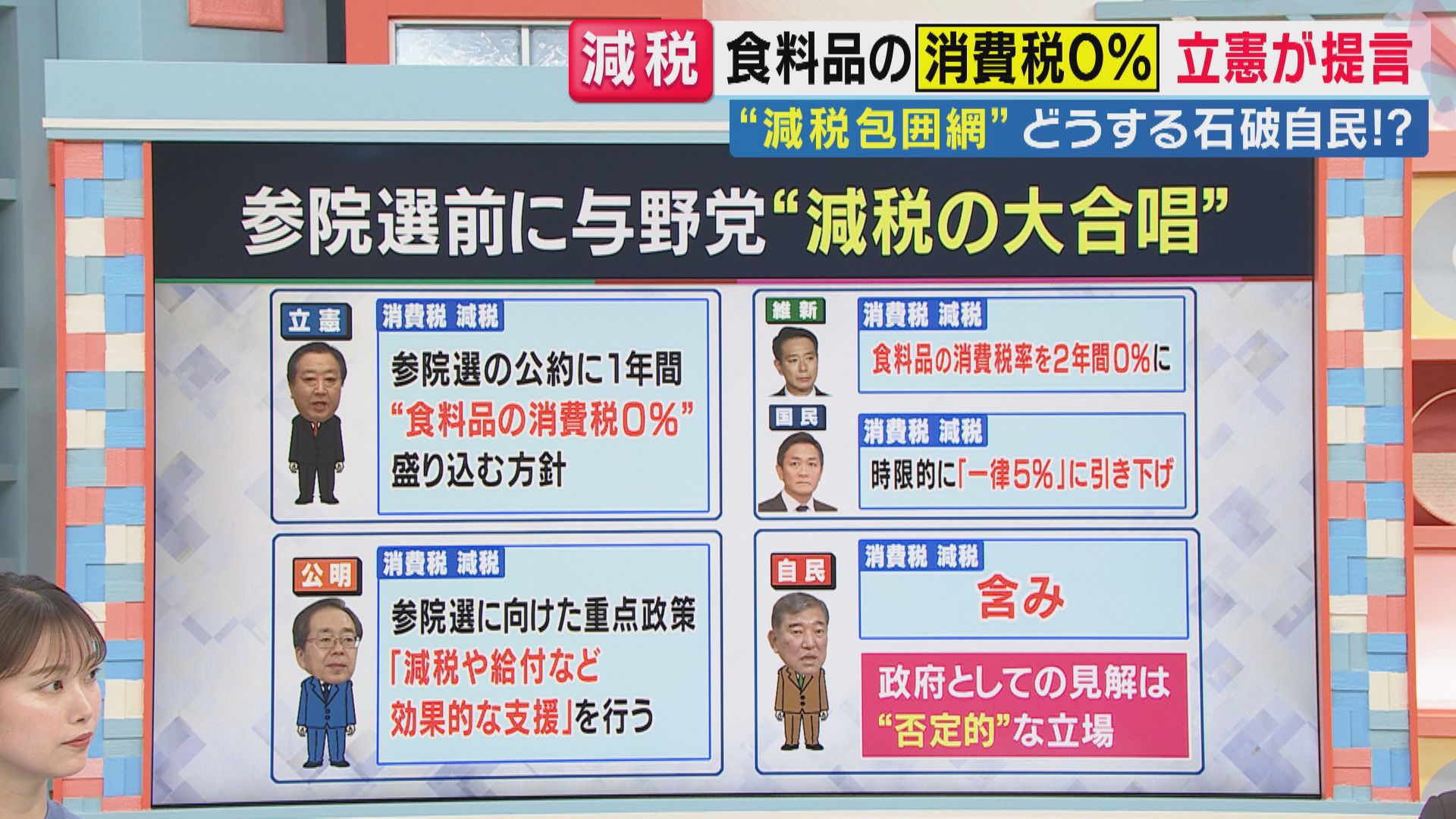 【ジャーナリスト 鈴木哲夫さん】「今度の参議院選挙の最大の争点が、多分この減税。特に消費税の減税になるんじゃないかってそういう色になってきましたね。野党が全部とにかく減税っていう、多少何をどうするかの差はあるんだけど。