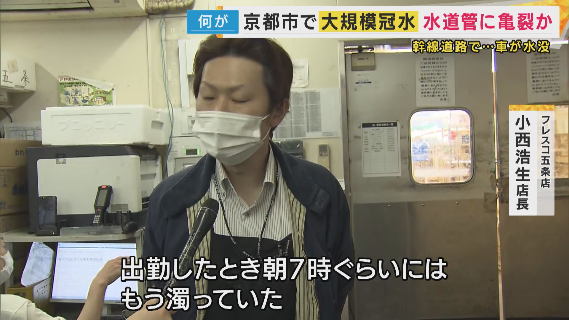 【フレスコ五条店 小西浩生店長】「普段(水道水は)食材を洗ったりに使っています。今はペットボトルの水で対応しています。一刻も早く復旧してほしい」