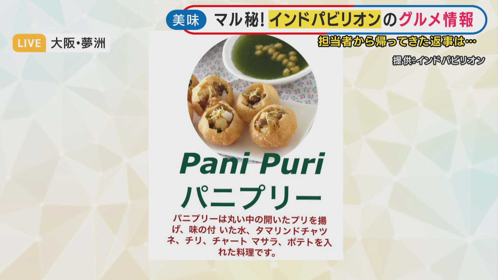 「Very soonということで、“もうすぐ”です。さらにインドパビリオンから料理の写真を入手していまして、『バターチキンとナン』『パニプリー』『サモサ』『アルーティッキ』など、幅広いメニューで本当においしそうです」