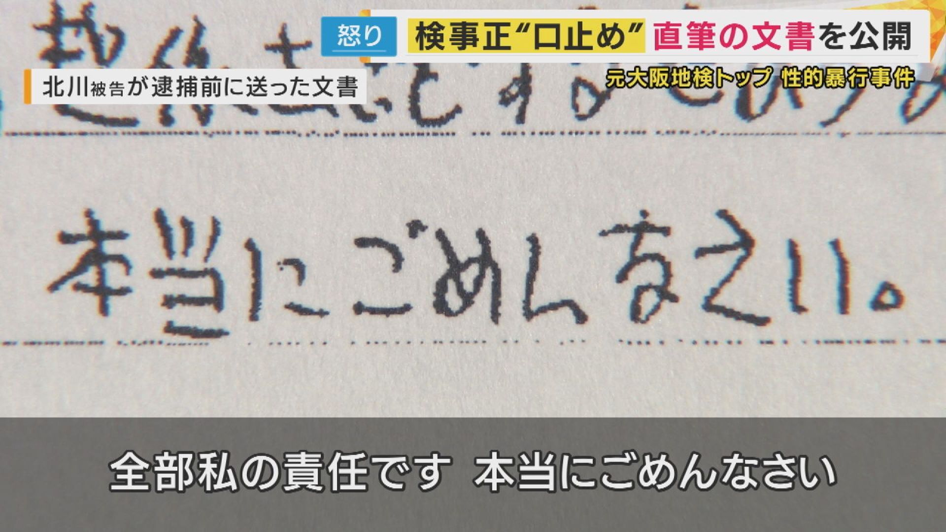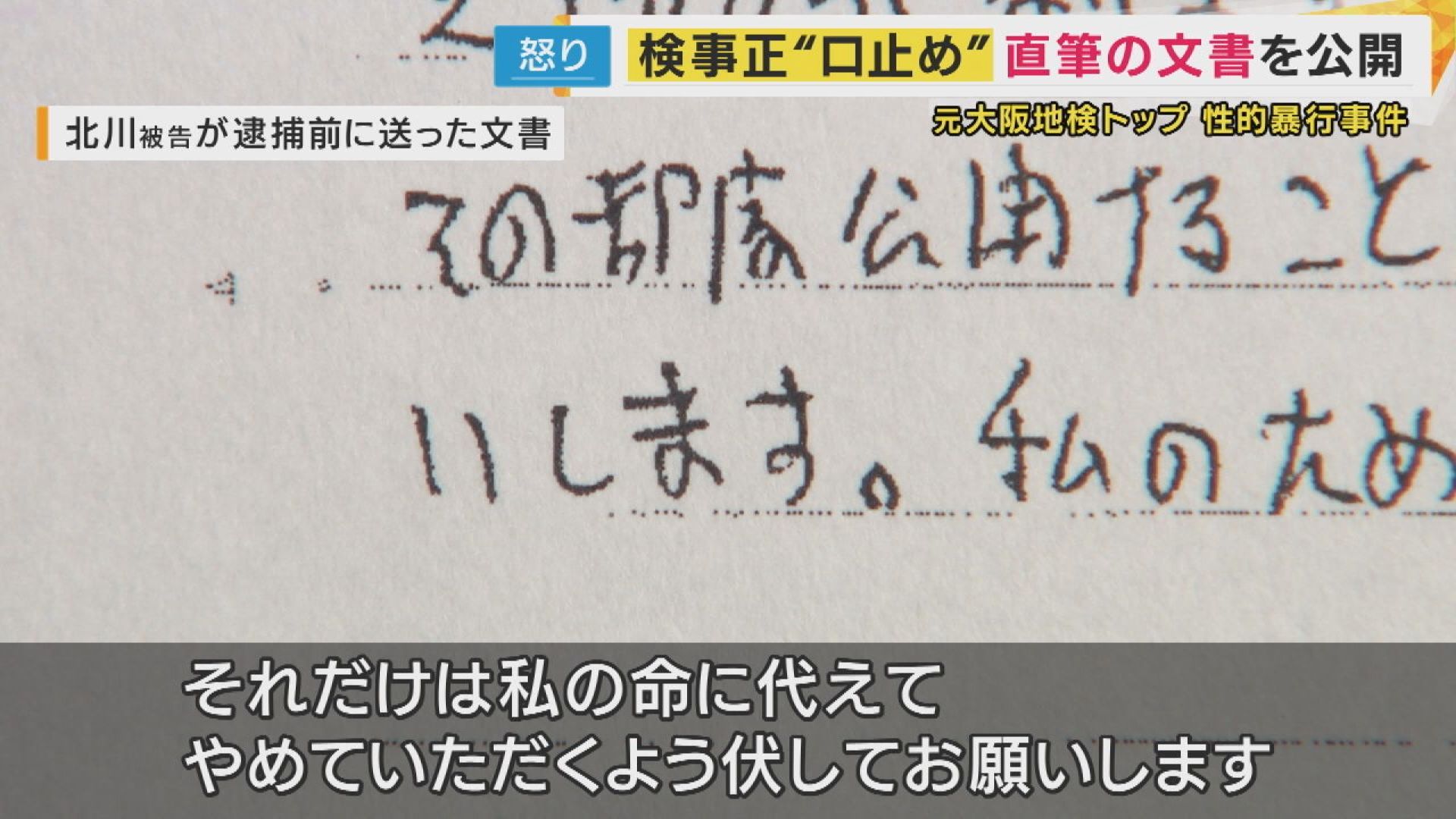 大阪地検のトップ・検事正だった北川健太郎被告(65)が、部下の女性検事に性的暴行を加えた罪に問われている事件で、女性検事が北川被告から渡された直筆の文書を公開しました。