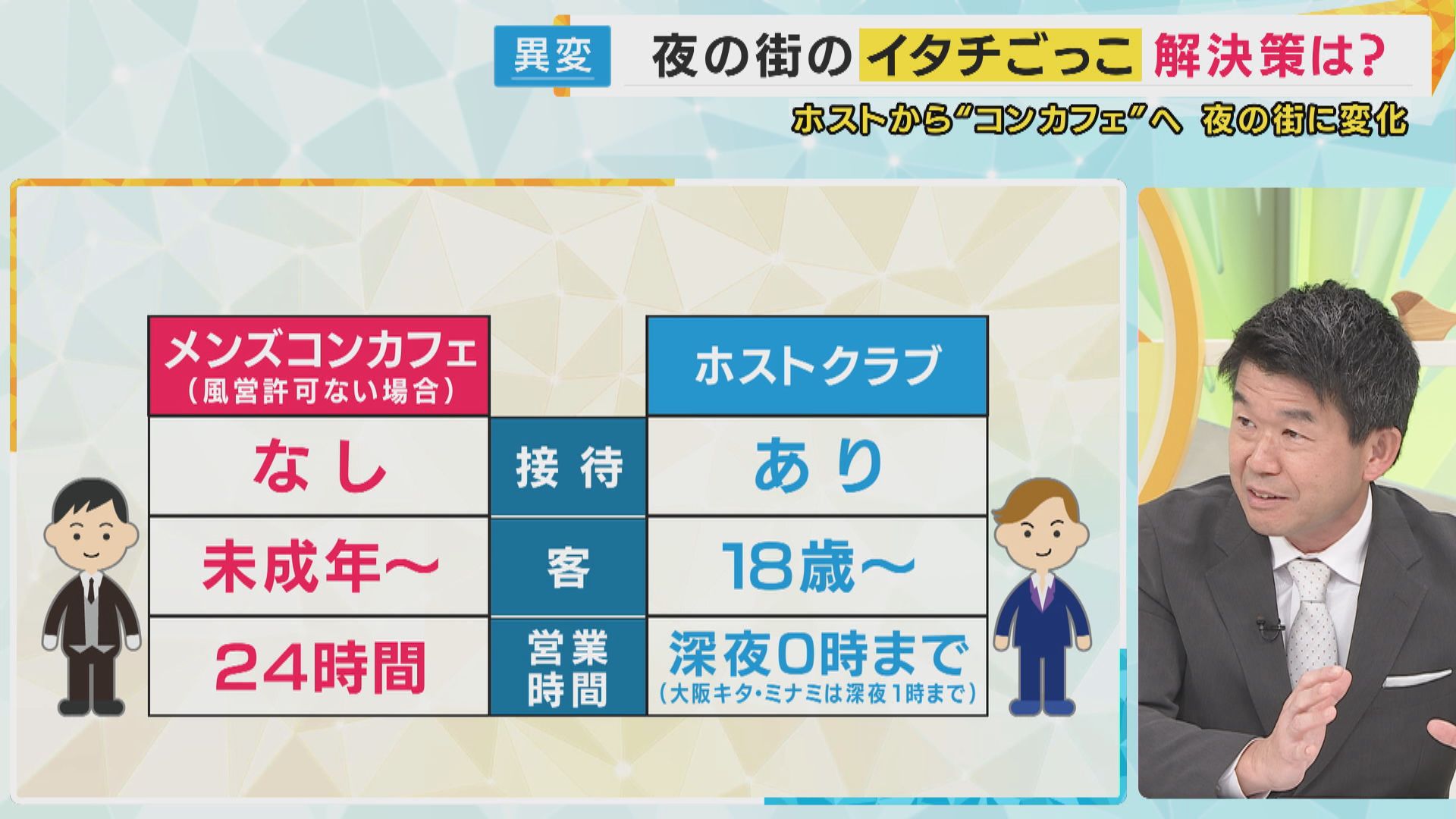 【関西テレビ 神崎博報道デスク】「ホストクラブは、客の入場制限があって、18歳以上じゃないとダメだったんですけど、規制を厳しくしたあまり業態がある種、コンカフェに移ってしまった。コンカフェはカフェなので、未成年の人でも入れちゃうところがあるんですね。(ホストクラブと)同じような被害が出る恐れがあり、しかも未成年が犠牲になる可能性もあるので、そこに対して何らかの法改正や取り締まりは必要になってくるんじゃないかと思います」