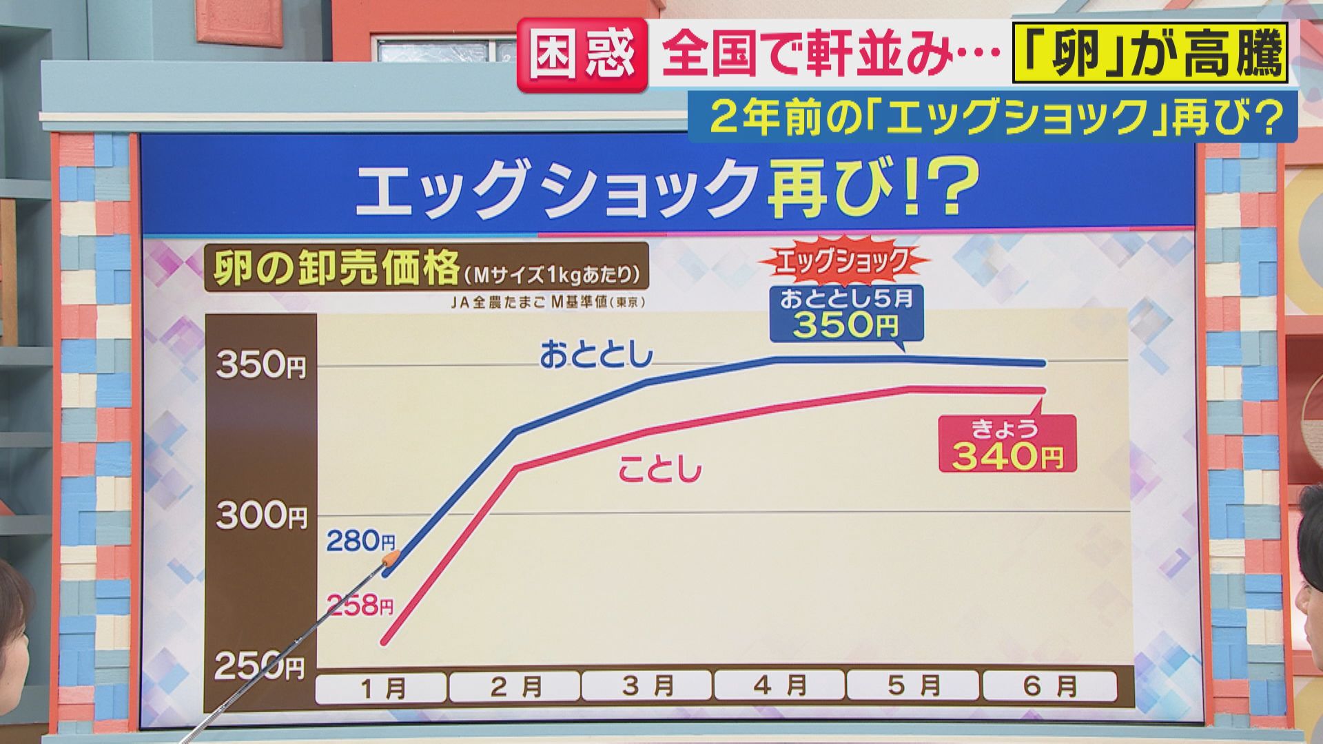 JA全農卵によりますと、2日、東京の卸売価格がMサイズが1キロ当たり340円に。これはエッグショックと呼ばれた2023年5月の350円に迫る価格です。