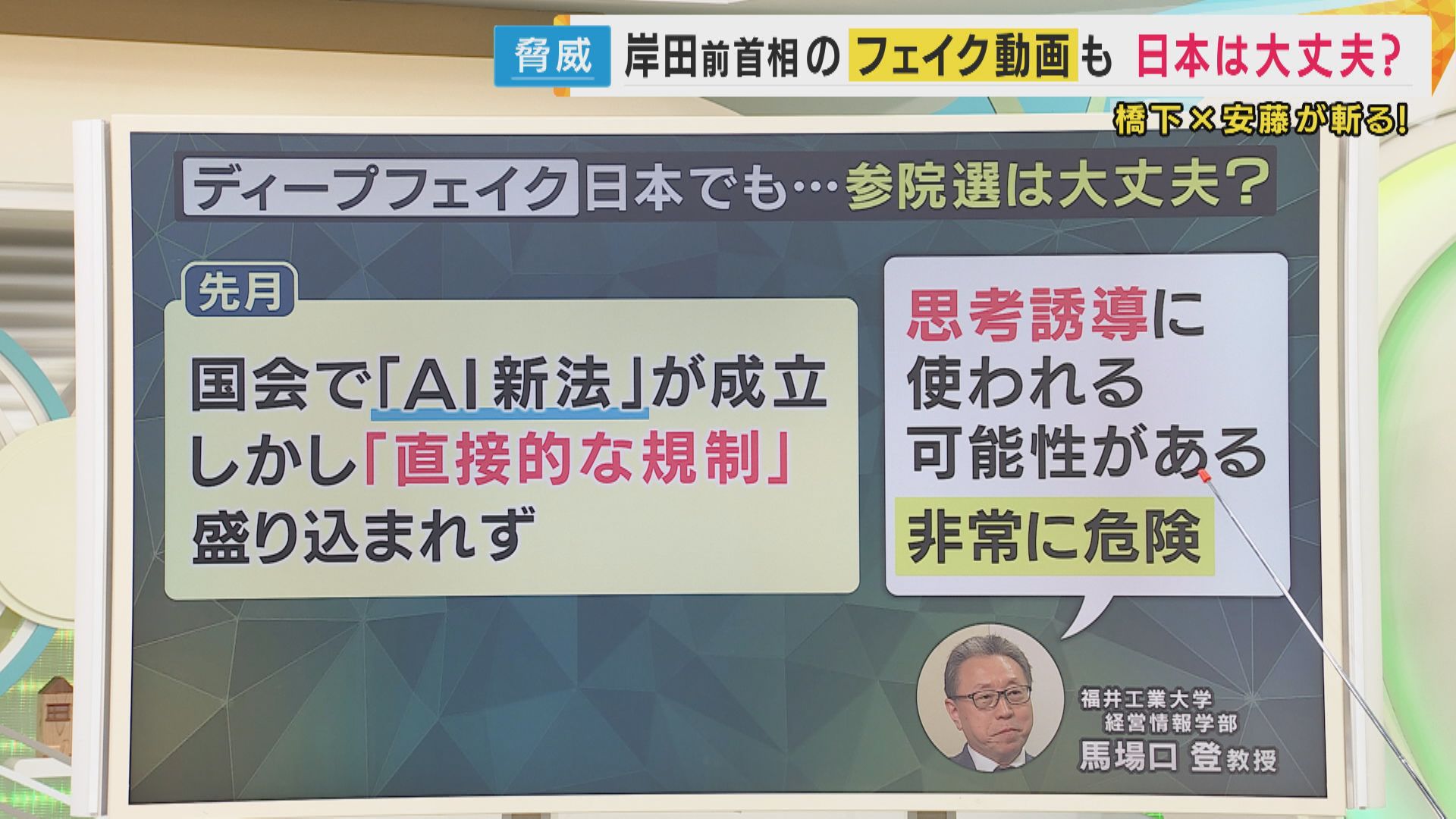 福井工業大学の馬場口教授は、「このままだとディープフェイクなどが思考誘導に使われる可能性があるとして、非常に危険」と述べています。