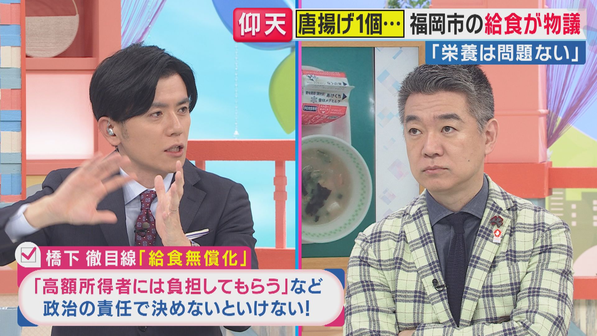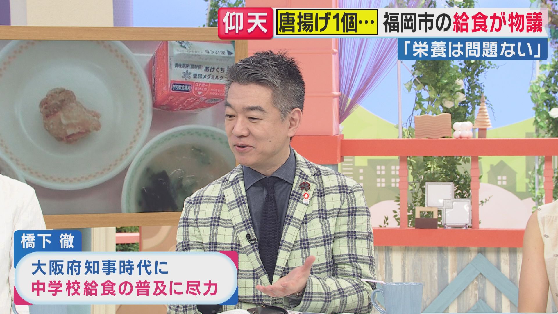 【橋下徹氏】「給食って本当にものすごく少ない予算で、限られた給食費で、トータル1カ月のメニューを立てる。むちゃくちゃ難しいですよ。だから1日唐揚げ1個という日もある」