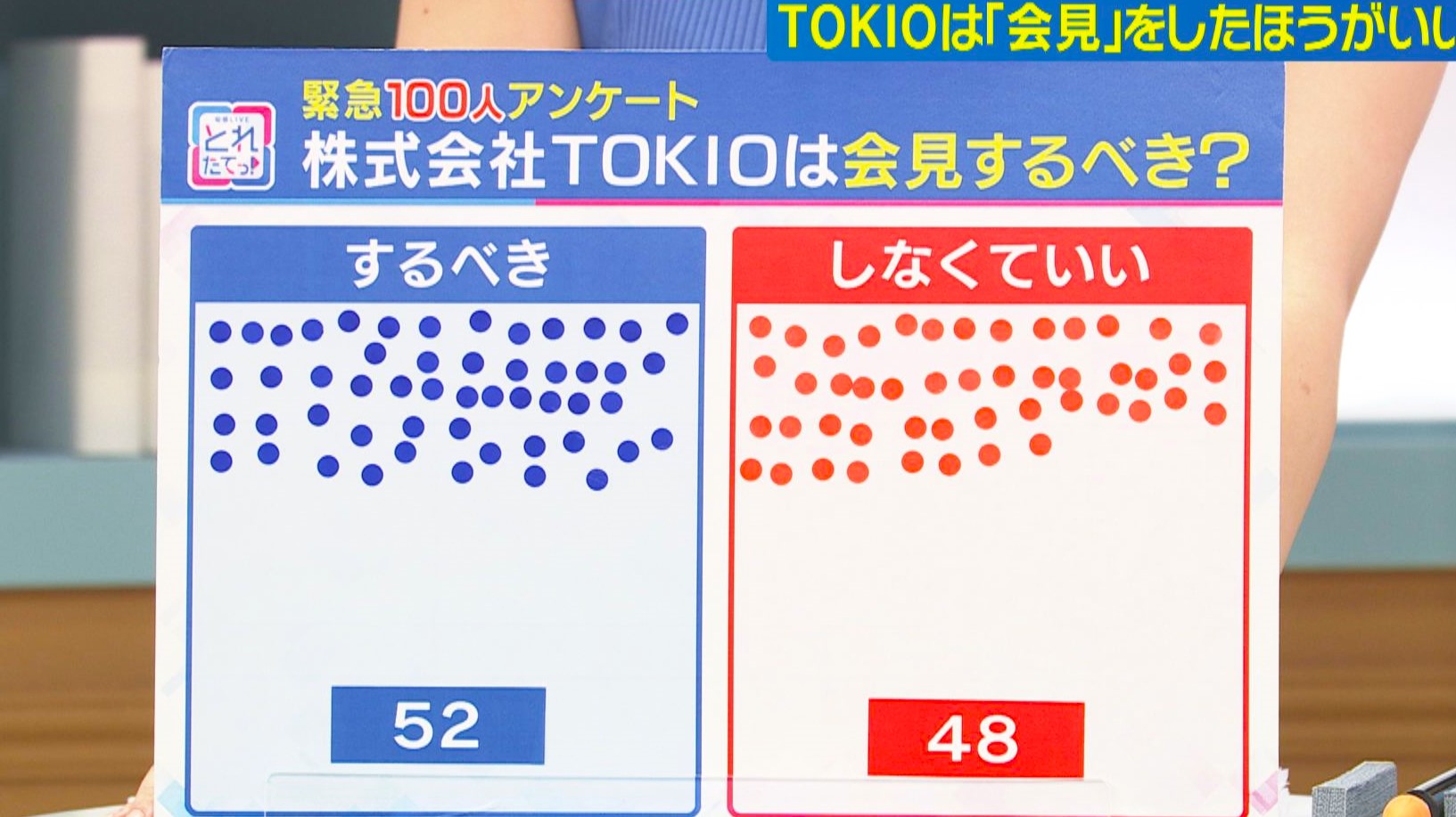 関西テレビ「旬感LIVEとれたてっ!」 は、「株式会社TOKIOは会見をした方がいいのか?」というテーマで、100人アンケートを実施しました。