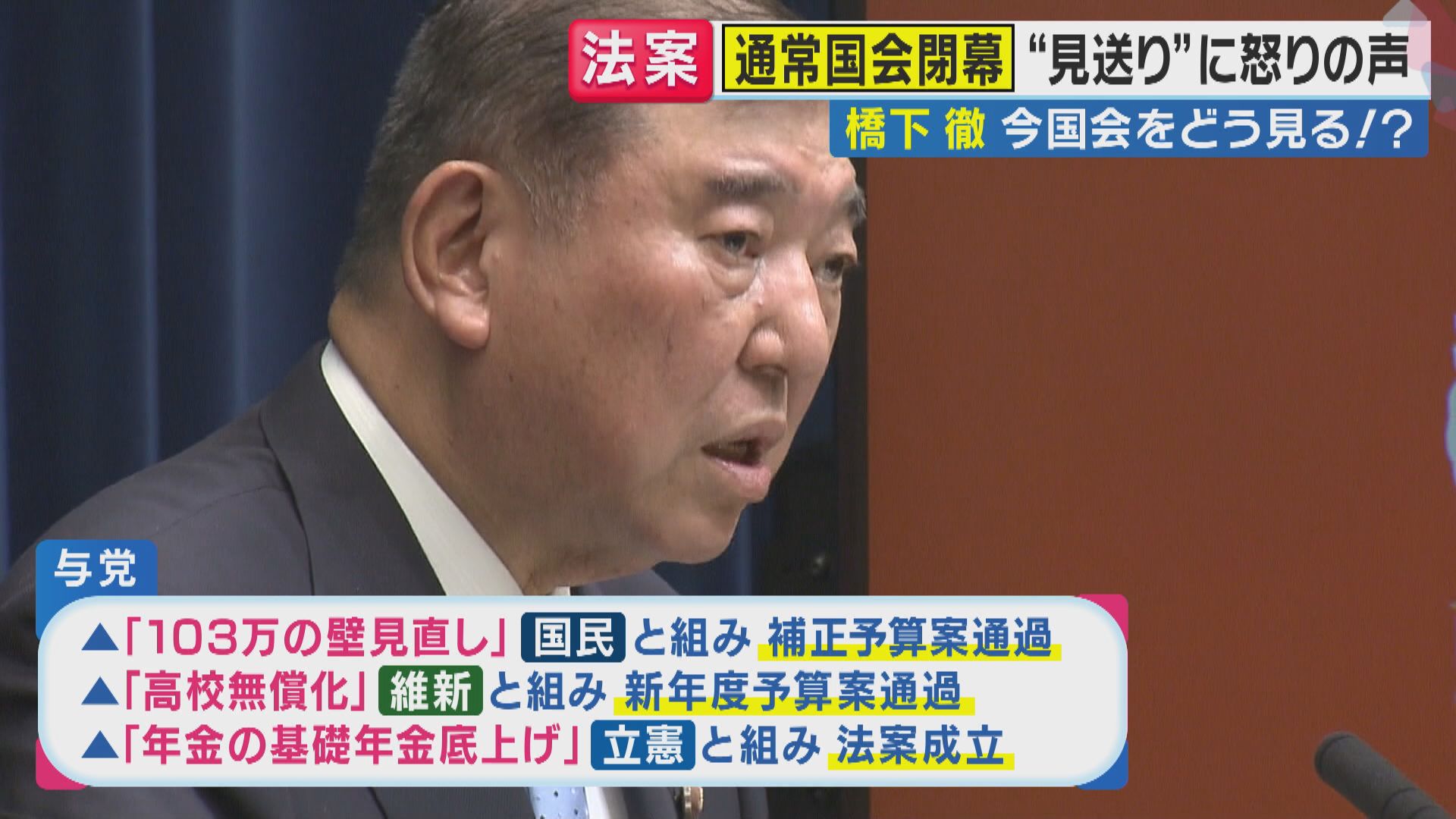 これ(スタジオモニターの「主な法案の成否」一覧表)もね、ちょっと誤解があるのは、見送り、見送りばっかり、赤色が見えますよね。成立が下2つありますけど、実はその下に、あと50個ぐらい成立があるんですよ。今回の法案成立率は98パーセント。だから、少数与党なのに、よくこれ野党の同意を取り付けて成立にしたなと。