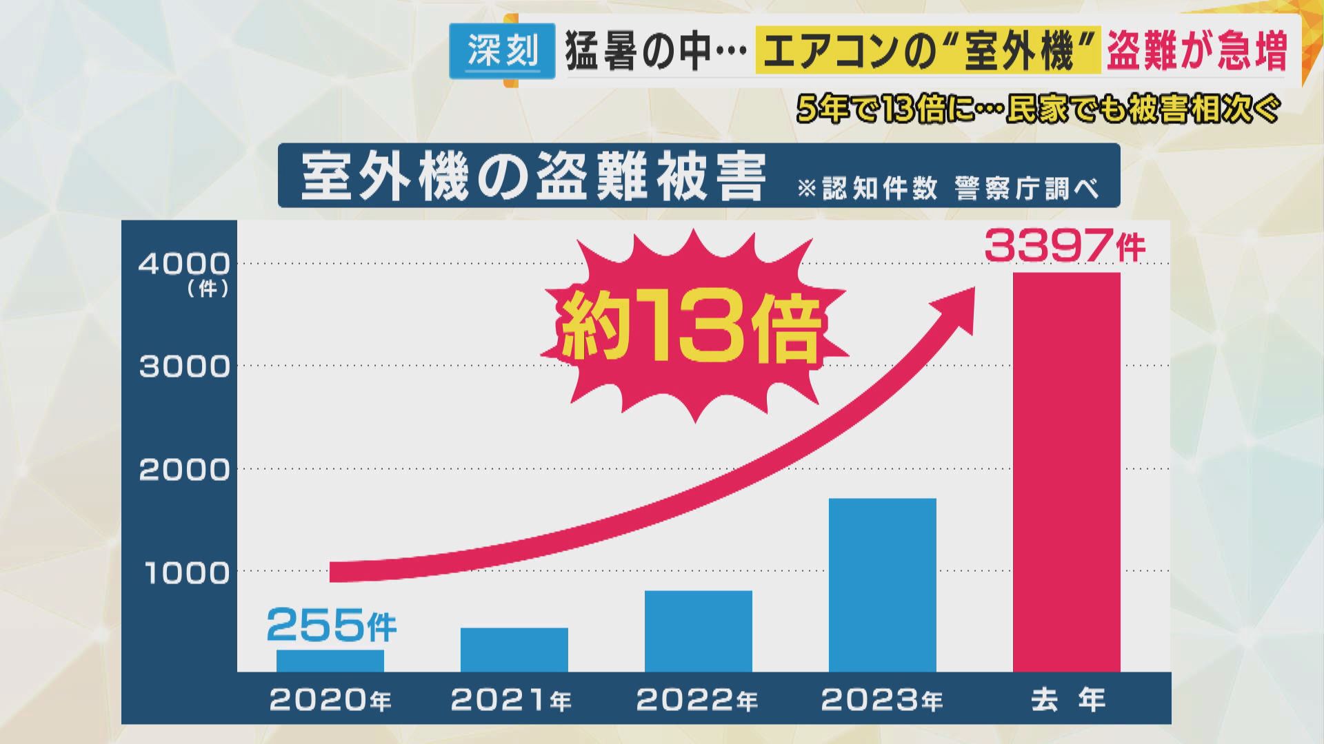 【防犯アドバイザー 京師美佳さん】「最初は太陽光のケーブルとか、企業の物が狙われていたが、対策が進んできて、できるだけ銅のケーブルを使わない方向になってきた。そこで個人宅が狙われるようになった。室外機は外の目立たないところに置かれていることが多いので、盗みやすい」