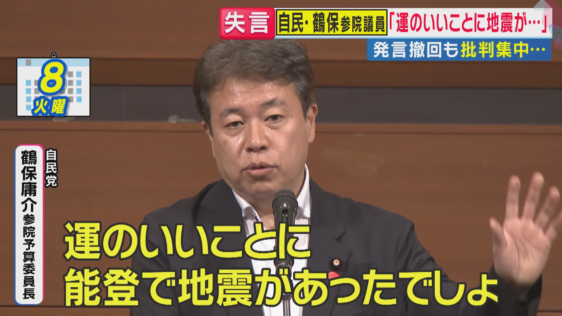 【自民党 鶴保庸介参院予算委員長】「今回の発言につきまして、能登地方が被災したことを“運よく”などと発言してしまいましたが、被災地への配所が足りなかったと反省しております」