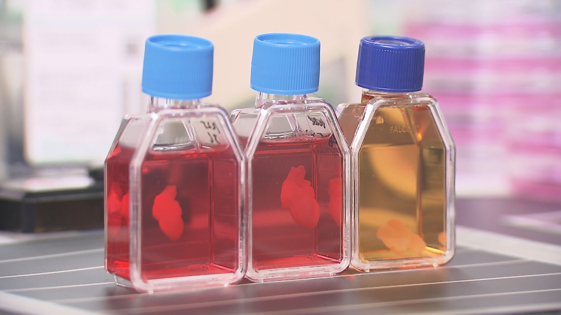 万博・開幕のおよそ1年前、長谷川さんと奥田さんの2人は、心臓の形をしたコラーゲンをスポンジ状に加工し、心筋細胞を染み込ませ、人の体温と同じ37℃前後で、外的な刺激を与えなくても自律拍動させるところまで開発を進めていた。