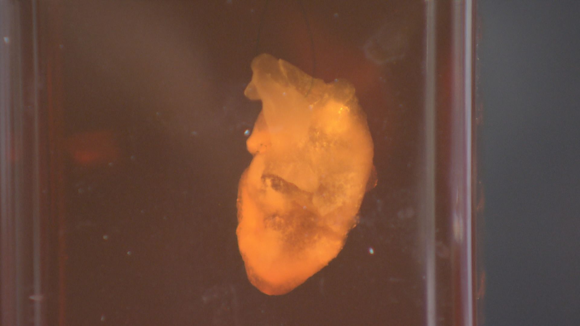 iPS心臓モデルにナイロンの細いワイヤ―を通し、培養液の中で吊り下げると、実際の心臓と同じように拍動したのだ。