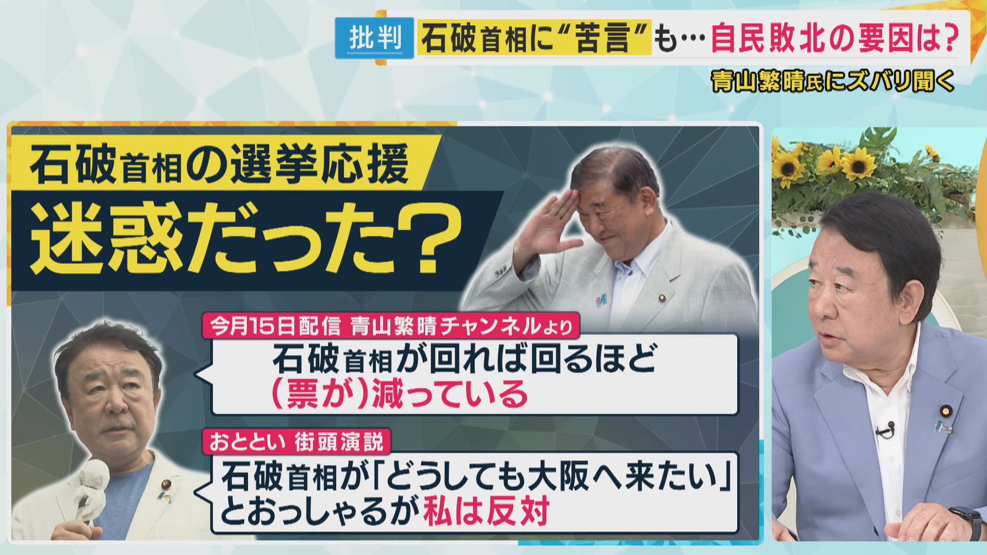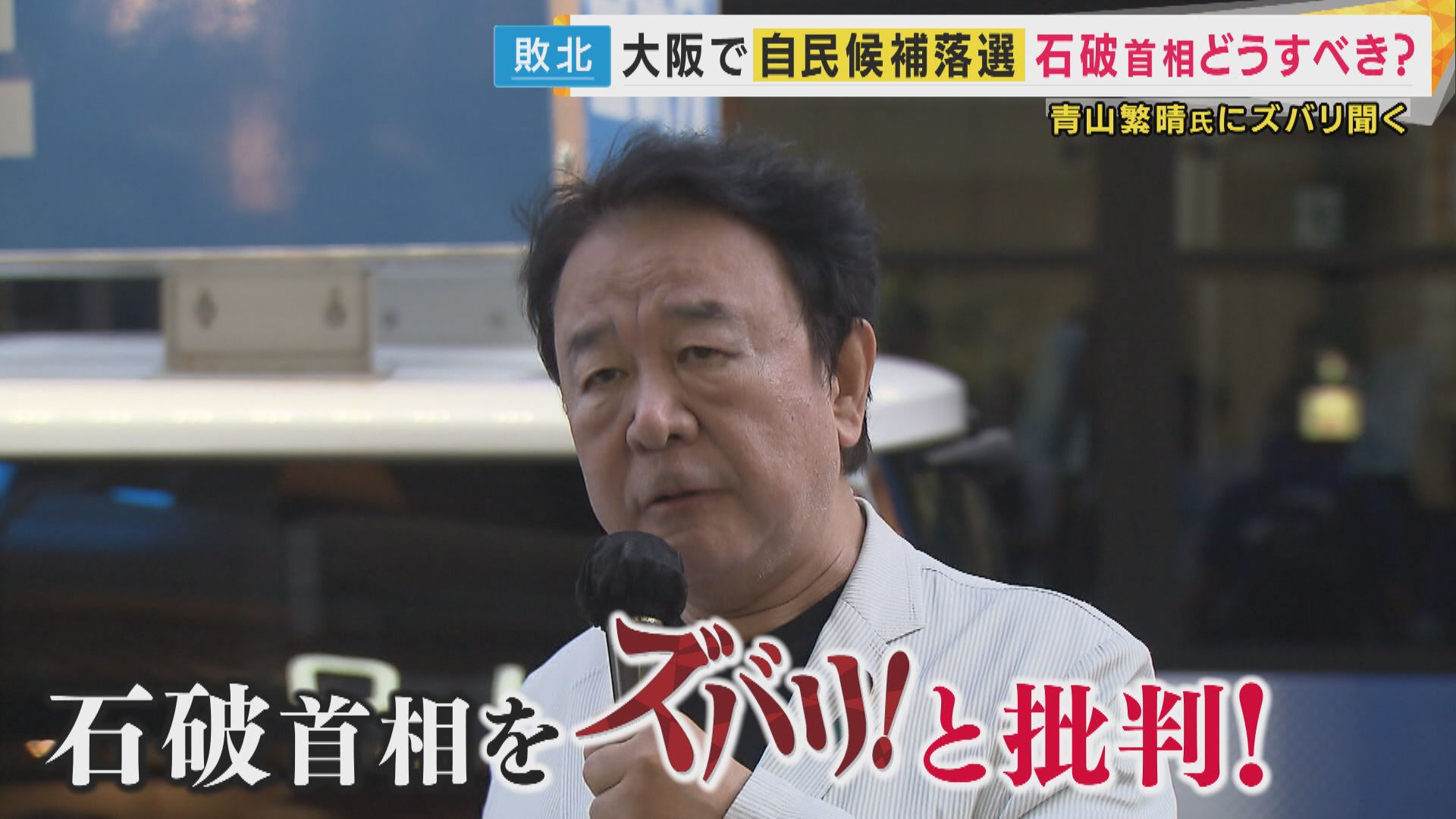 今回の参院選の敗北を受け、自民党・大阪府連会長からの辞意を表明した青山氏は「石破さんと対照的です」と、自身の決断について語ると、石破総理を厳しく批判しました。