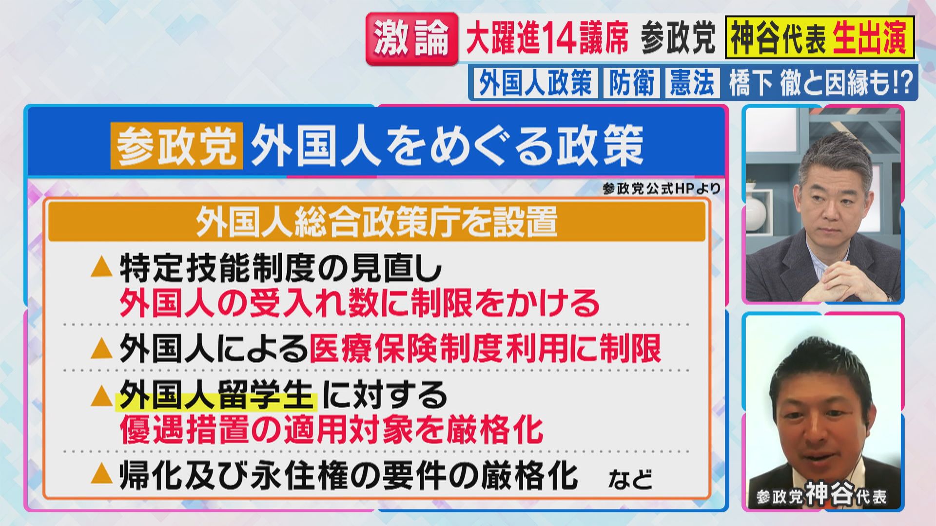 【参政党・神谷代表】「いや、私たちも外国人を一切受け入れないって言ってるんではなくて、やっぱり日本人と一緒に共生できる統合していける。そういう数が上限があるなと思っていて、やっぱり去年だけでも30万40万人という数はちょっと急激すぎるということなんですね。