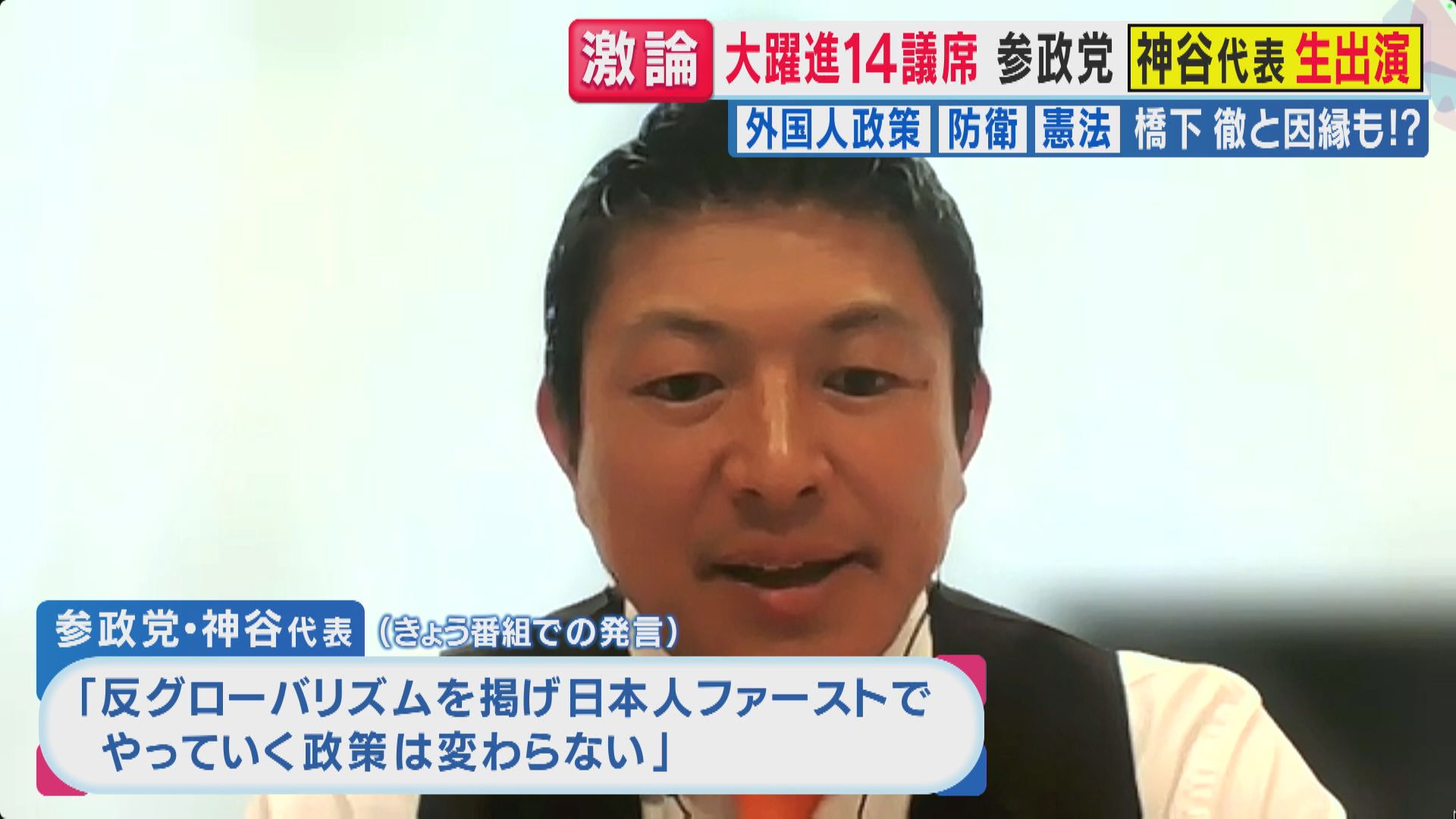 【参政党・神谷代表】「もともと我々は反グローバリズムということで。国際金融やそういう国際的な大資本ですね。そういったものだけが有利になるような社会ではいけないんだと。中間層の経済の不所得の不底上げや、国内の製造力や教育力。そういったものをしっかりと守るということをやっていくので。これはキャッチコピーは選挙ごとに変わるかもしれませんけども、やっていく方向性に関しては、政策に関しては変わらないと」